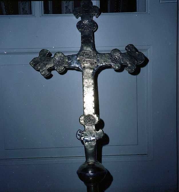 Description : Croix fleurdelisée, avec noeud sphérique, creux ; âme de bois recouverte de feuilles de laiton autrefois argentées, décorées par gravure au trait, nimbe du Christ et agneau Pascal repoussés ; Christ en bronze, revers évidé, actuellement doré ; les feuilles de laiton sont fixées par des clous en laiton en forme de fleurs à 8 pétales