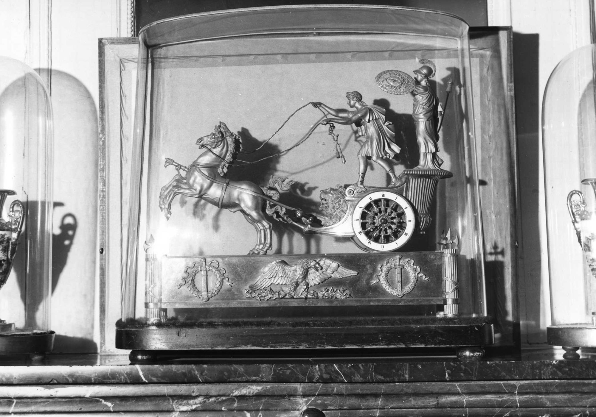 Description : socle rectangulaire surmonté du char d'Apollon, avec Minerve se tenant à l'arrière, le cadran constituant la roue gauche.