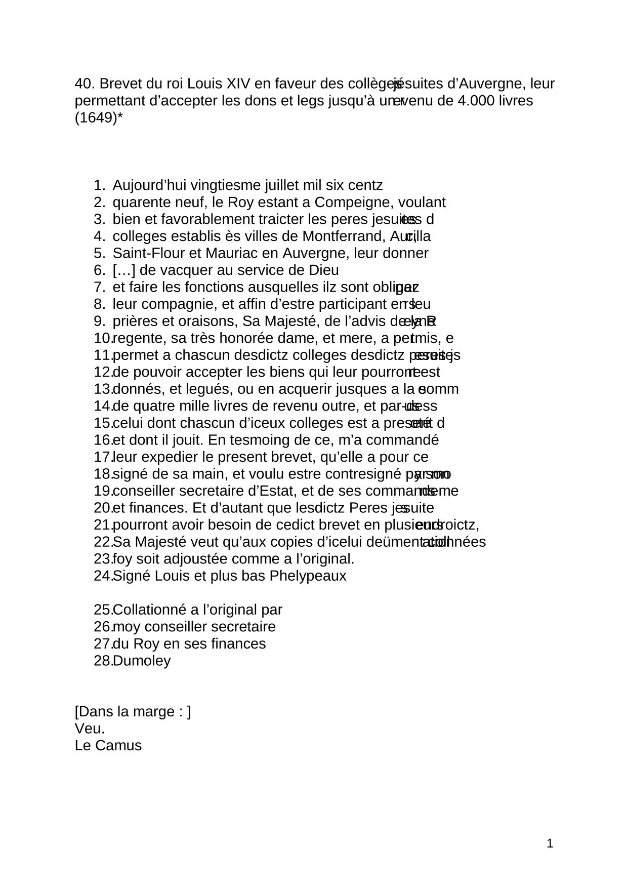Brevet du roi Louis XIV en faveur des collèges jésuites d'Auvergne, leur permettant d'accepter les dons et legs jusqu'à un revenu de 4.000 livres (1649) Transcription (13.6 Ko)