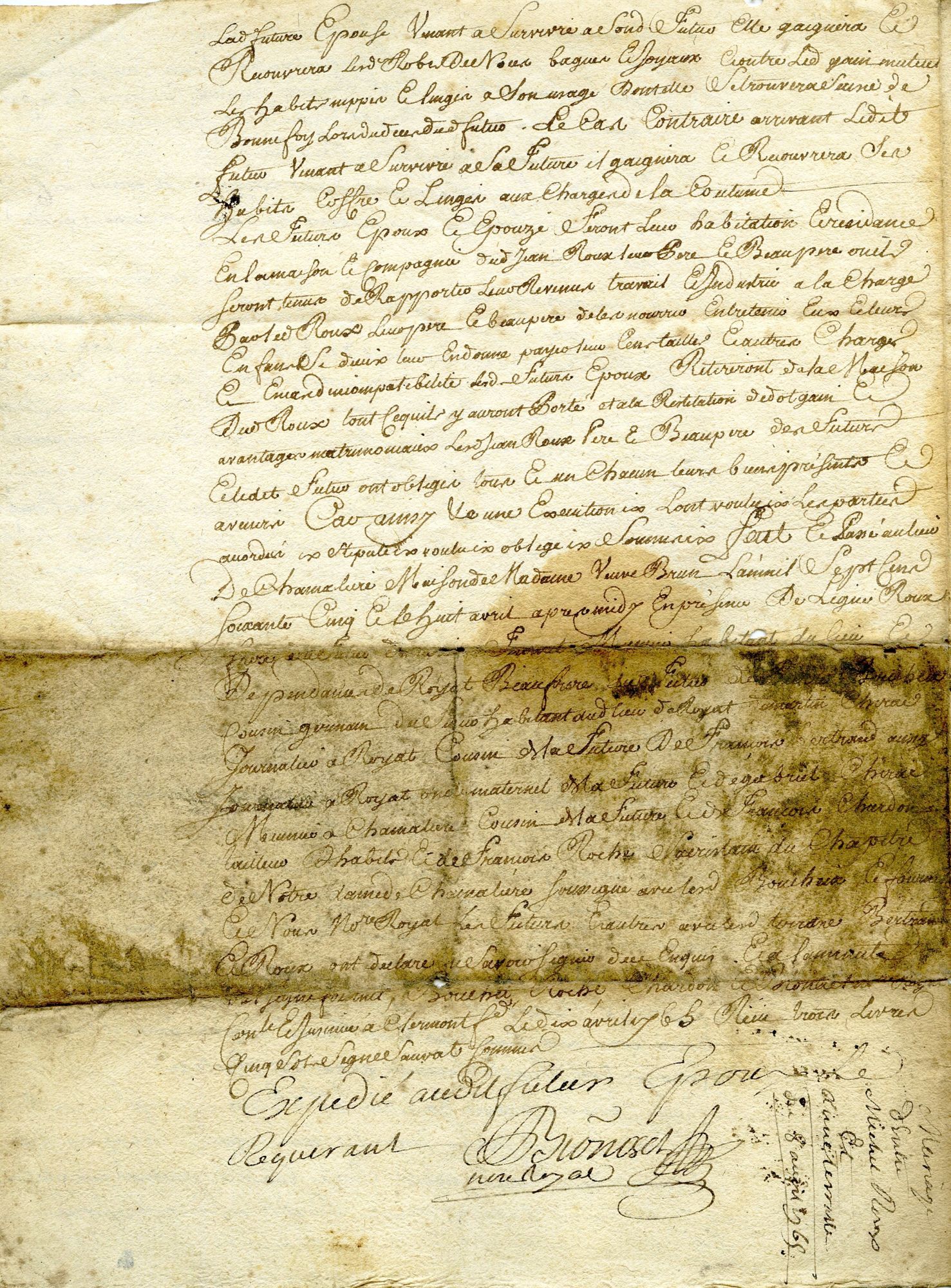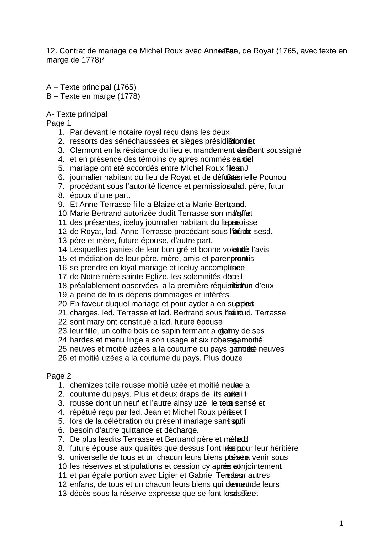 Contrat de mariage de Michel Roux avec Anne Terrasse, de Royat (1765, avec texte en marge de 1778) 1 4 2 4 3 4 4 4 Transcription (13.5 Ko)