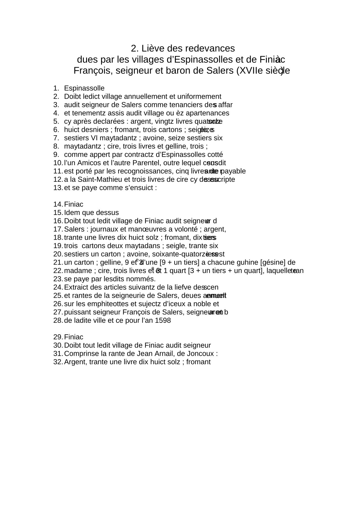 Liève des redevances dues par les villages d'Espinassolles et de Finiac à François, seigneur et baron de Salers (XVIIe siècle) Transcription (6.9 Ko)