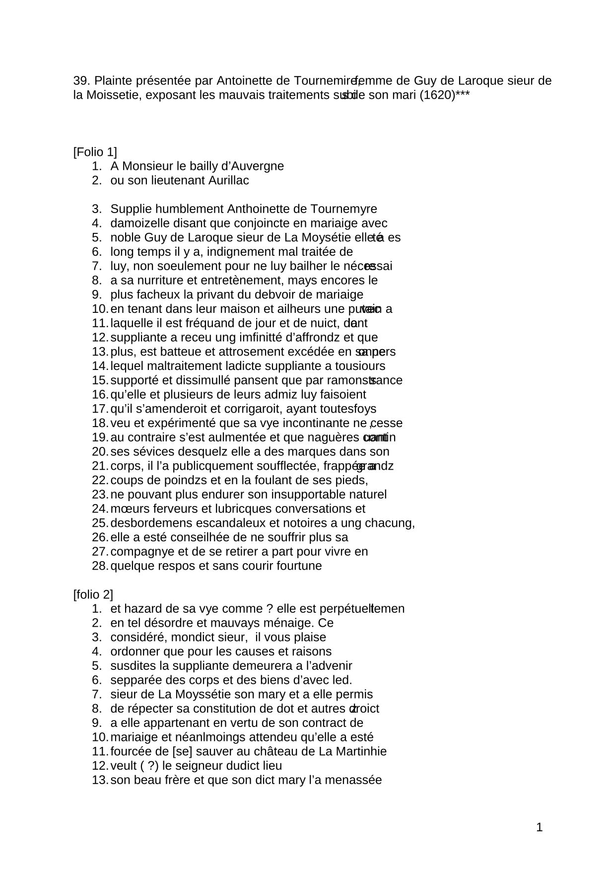 Plainte présentée par Antoinette de Tournemire, femme de Guy de Laroque sieur de la Moissetie, exposant les mauvais traitements subis de son mari (1620) 1 2 2 2 Transcription (10.0 Ko)