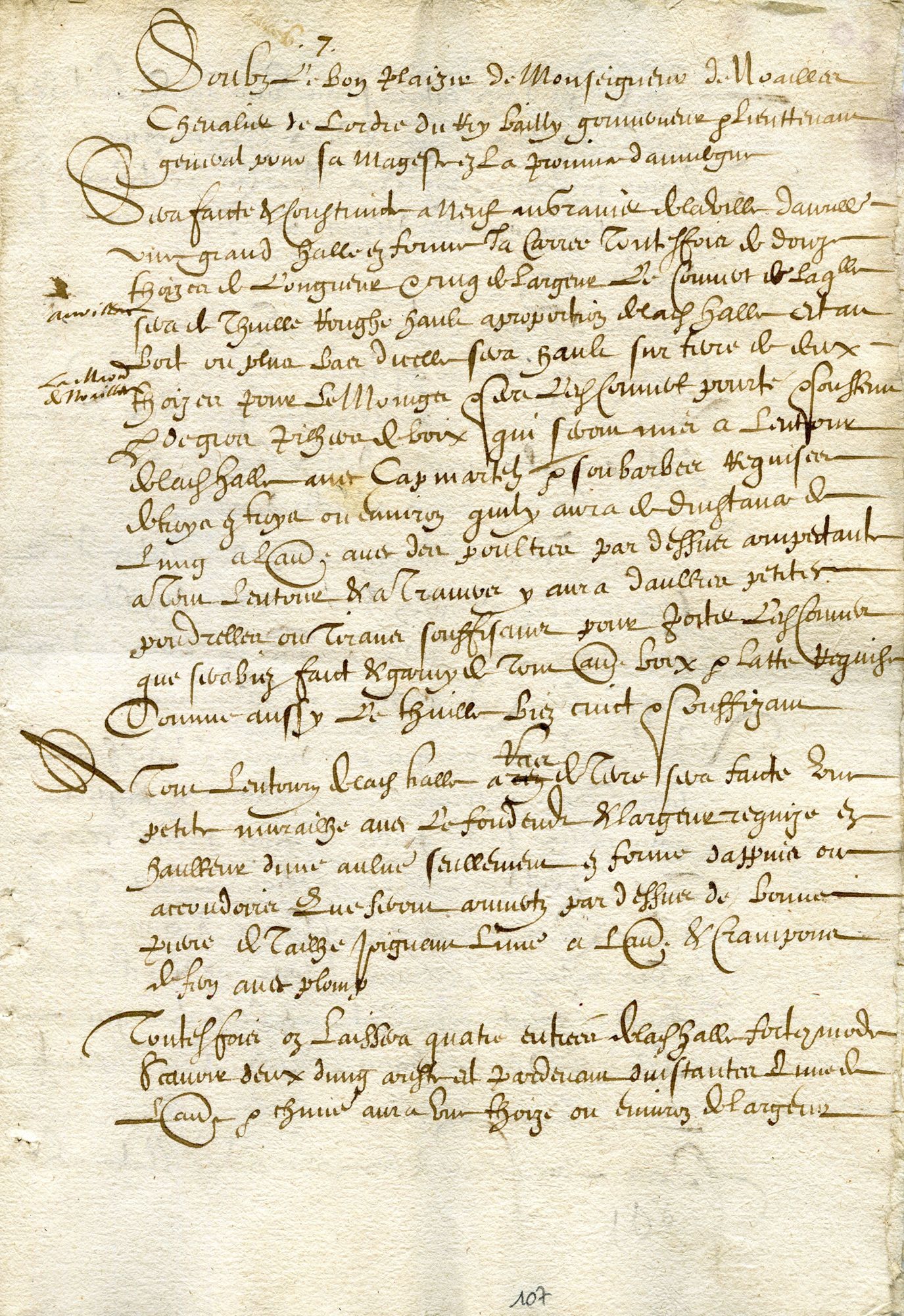 Contrat passé entre Henry de Noailles, gouverneur d’Auvergne, Jehan Reyrolles, maçon et Durand del Rieu, charpentier, pour la construction d’une halle sur le gravier d’Aurillac (1612) Transcription (6.6 Ko)
