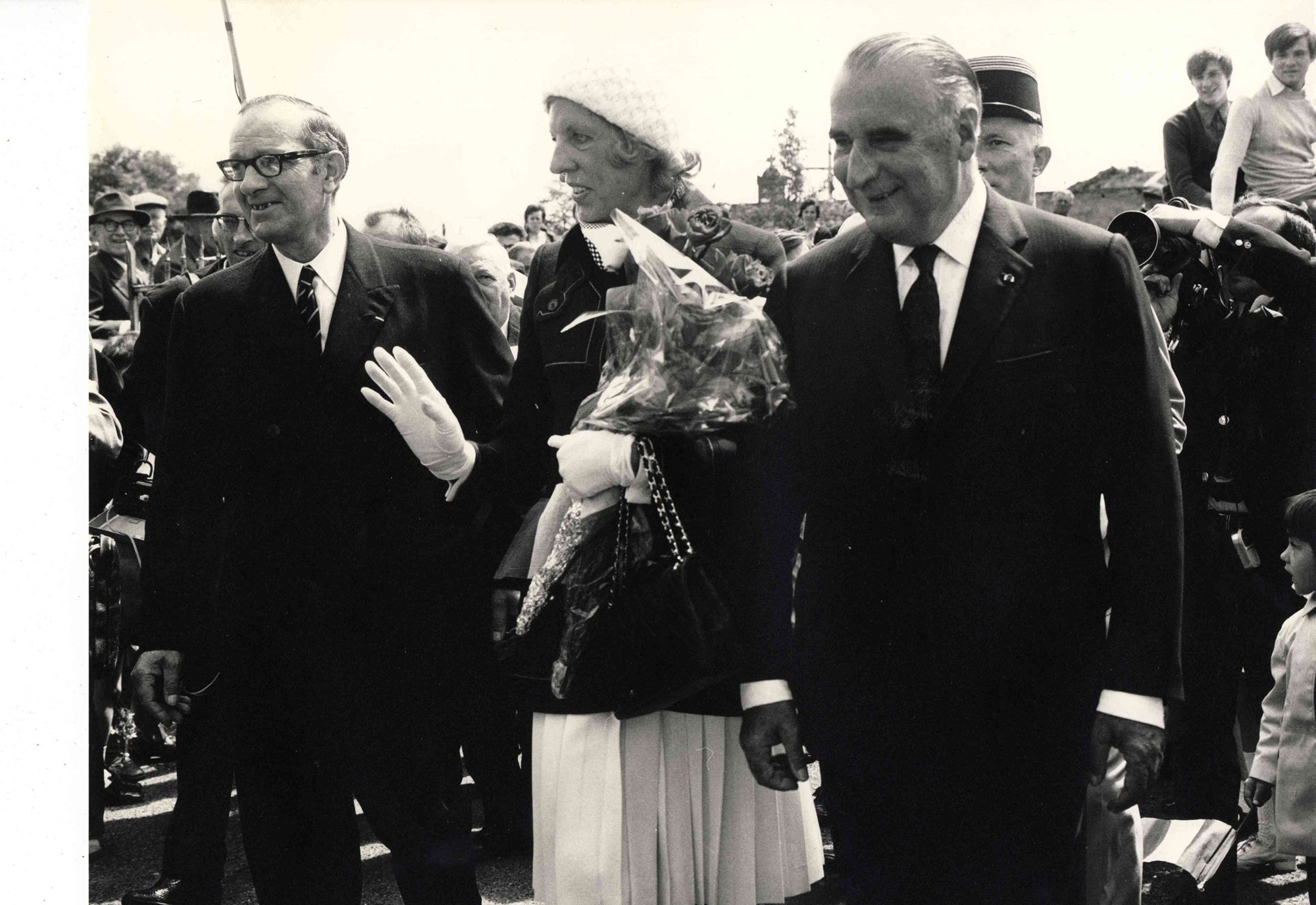 Le registre est présenté avec la photographie d’un voyage officiel de Georges Pompidou, alors président de la République, à Montboudif en 1972. De gauche à droite :