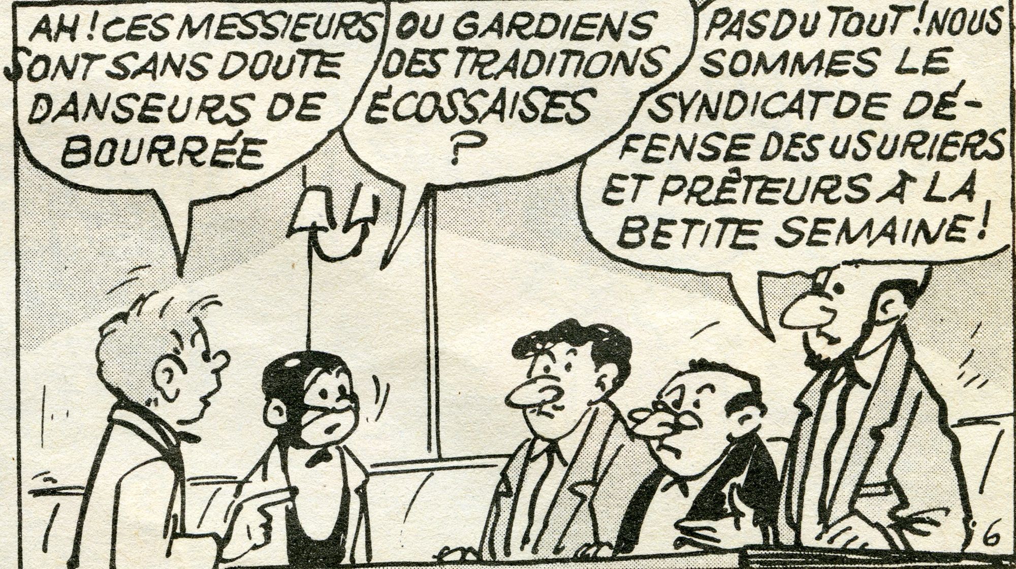 Ainsi le décor est-il campé, avec tous ses lieux communs : l’avarice, la solidarité familiale, le chuintement et l’accueil de diverses amicales (danseurs de bourrée, écossais et… le « syndicat de défense des usuriers et prêteurs à la betite semaine »). Cette dernière compagnie, même si elle ne dit pas son nom, est aisément reconnaissable : prononciation d’Europe centrale, nez busqués, usure. Il est étonnant de voir ainsi dépeints les Juifs, en 1970, sous les mêmes traits que dans la propagande antisémite du début des années 1940 : Bibi Fricotin et le Juif Süss (film de 1940), même « humour » antisémite ?