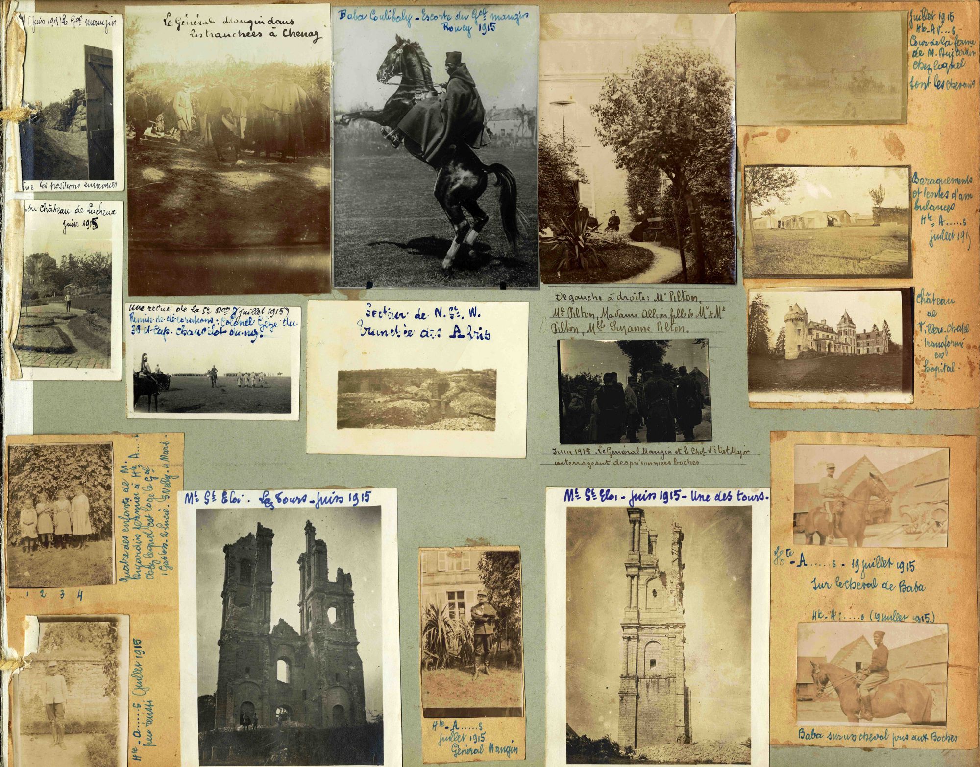 Propriété d’un collectionneur aurillacois, cet album photographique réunit, en 23 pages, près de 500 photographies de la Grande guerre, prises par ou pour le lieutenant Maurice Brunet, commandant l’escorte du général Mangin. Toutes les photographies sont légendées très soigneusement (noms de lieux et de personnes, dates), ce qui lui confère un intérêt exceptionnel. On peut suivre la campagne du général Charles Mangin (1866-1925), qui commanda la cinquième division d’infanterie. Convaincu que la « force noire » était un atout de l’armée française, le général Mangin avait comme ordonnance un Bambara nommé Baba Coulibaly, que l’on voit à plusieurs reprises dans l’album.