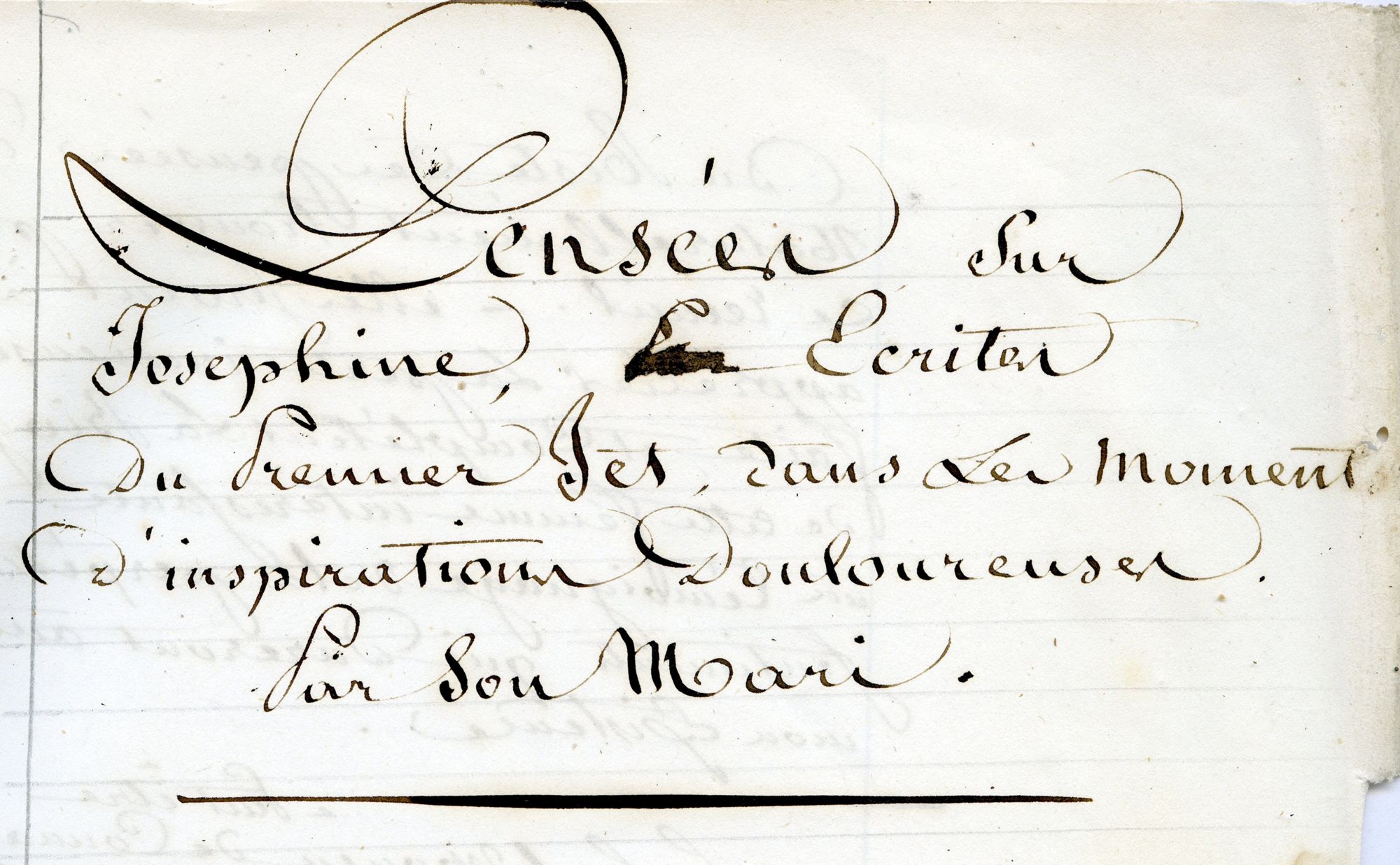 « Réflexion. Un jour Joséphine crut qu’elle n’était pas aimée ! Des inconséquences dans la conduite de son mari, des plaisanteries de mauvais goût, quelques mots amers qui échappèrent de sa bouche et contre son cœur, et qu’il expie par les remords les plus cuisants, troublèrent un instant la douce paix de ma chère Joséphine (…) Ah si Joséphine avait pu deviner mes secrets sentiments, lire dans mon âme transportée de respect et d’amour pour elle, un seul mot, un seul geste, un de ses regards si nobles et si doux m’eussent fait tomber à ses genoux ! »