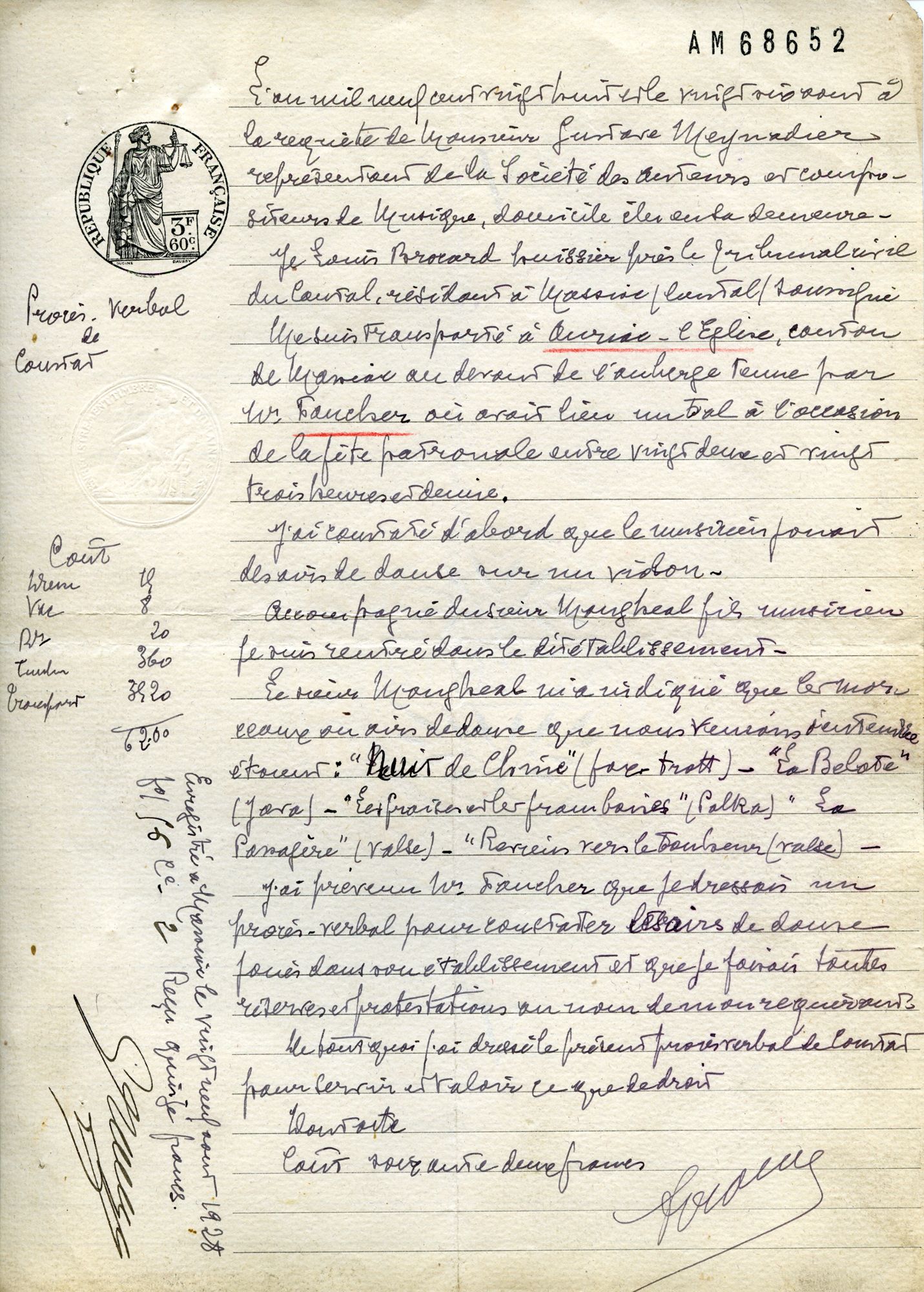 Le sieur Faucher est cité à comparaître devant le juge de paix de Massiac le 1er octobre 1928, car il n’a pas demandé à la SACEM son consentement préalable à l’exécution de ces morceaux, pour s’entendre condamner au paiement de la somme de 33,25 francs (majorée des intérêts) qu’il aurait dû payer, et, chose plus sérieuse, à une amende de 1.500 francs « pour usage sans droit de la propriété d’autrui et atteinte au droit moral des auteurs » – sans compter les inévitables dépens.