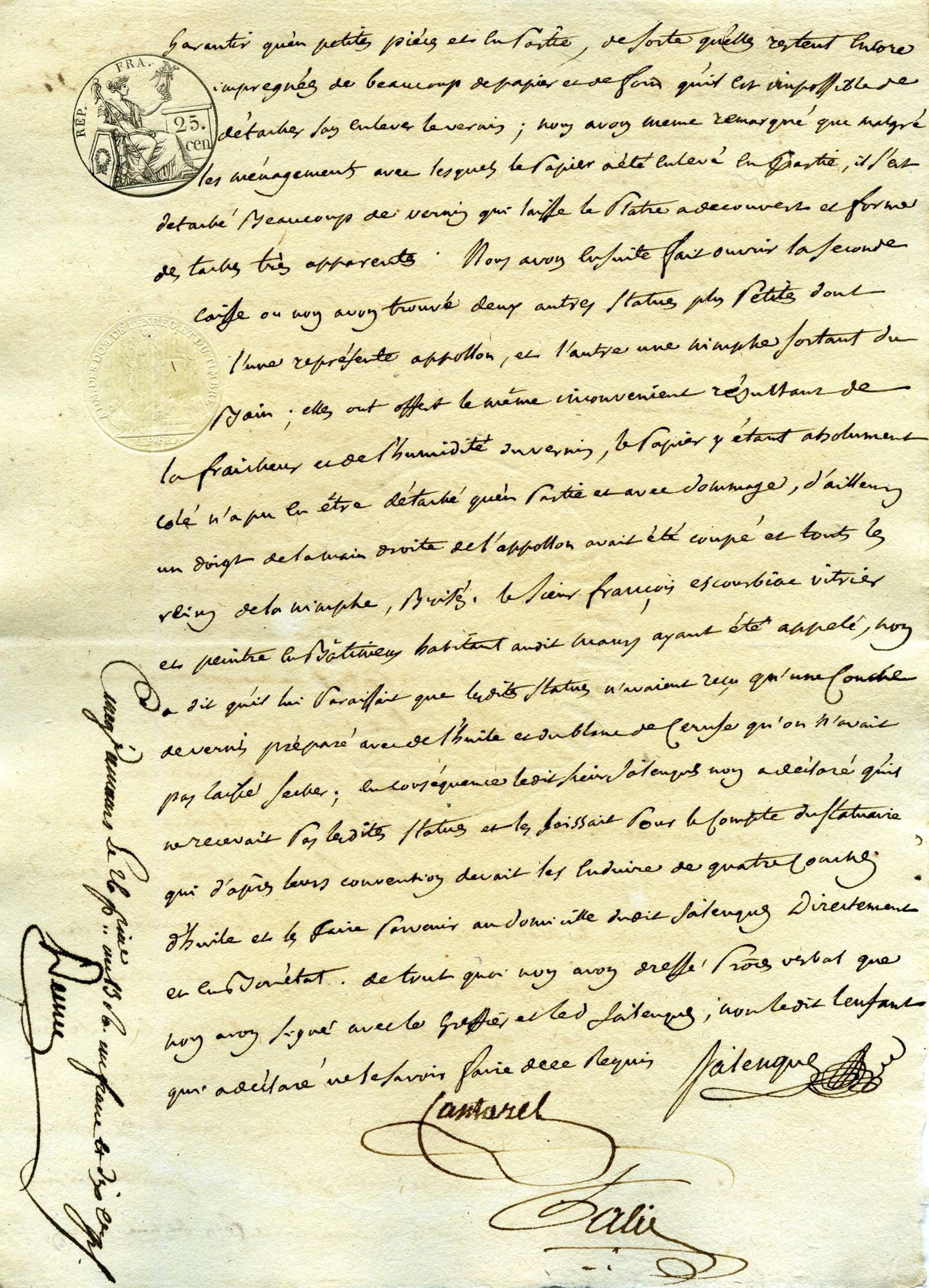 Ce 31 mai 1805, le « sieur Jean-Baptiste-Antoine-Benoît Jalenques, notaire à Maurs », est fort mécontent. Il fait constater par le juge de paix du canton, François Cantarel, que les statues de plâtre que vient de lui faire livrer un statuaire de Clermont-Ferrand sont en piteux état. « La douce mélancolie » est fêlée au point qu’elle se brise dès que Lenfant, le domestique du commissionnaire d’Aurillac, la prend dans les bras. La « Noyade » était entière, mais comme la « Douce mélancolie », elle est « enduite d’une couche de vernis si frais et si humide qu’on n’a pu en détacher le papier qui les couvrait et le foin destiné à les garantir ». Dans la seconde caisse se trouvent deux statues plus petites, « Appollon » (qui a un doigt coupé) et une « Nimphe sortant du bain » ; là encore, on ne peut détacher le papier du vernis encore frais.