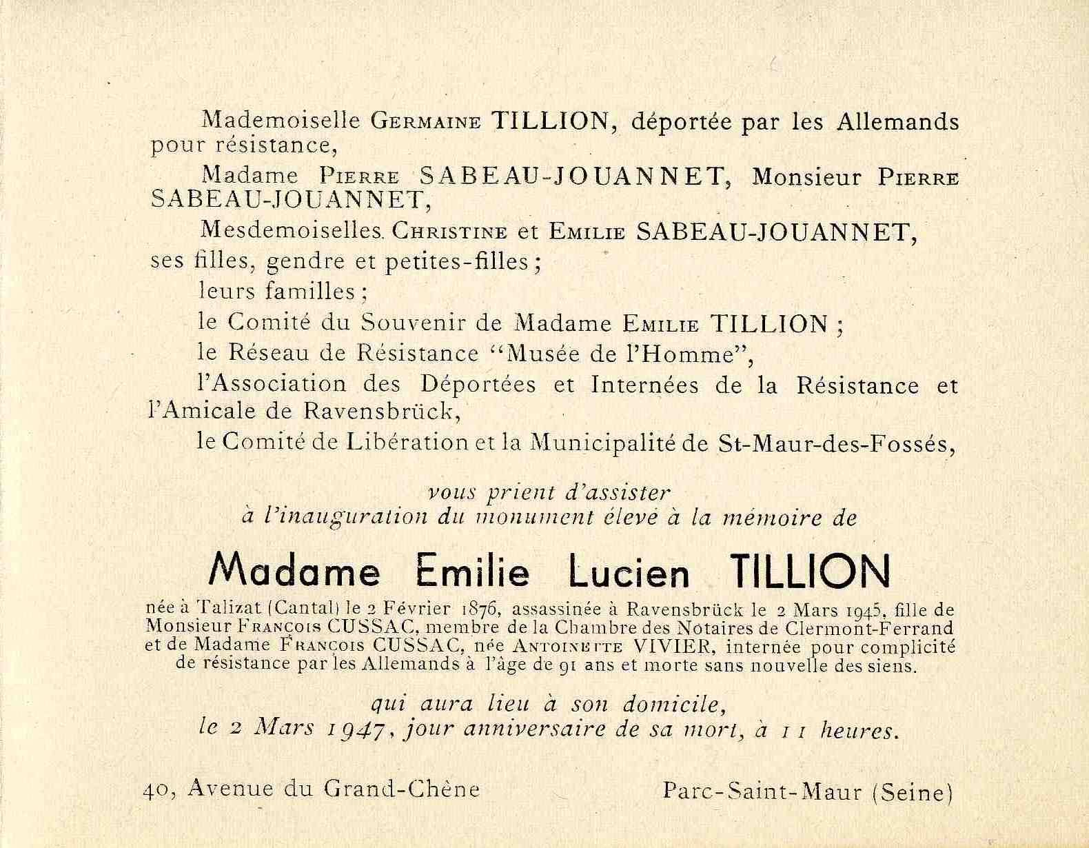 Écrivain et critique d'art, sa mère Emilie Tillion (ici photographiée vers 1900) a créé la collection des « Guides bleus » chez Hachette, avec son mari Lucien Tillion. Ce dernier étant mort en 1925, elle élève seule leurs deux filles, Germaine et Françoise, et termine les trois gros volumes de « Pays d'Europe ». Agent P1 et boîte aux lettres du Groupe du musée de l'Homme dès octobre 1940 (c'est elle qui a la connexion avec les grands écrivains et artistes du réseau), elle est arrêtée avec sa fille Germaine le 13 août 1942 pour avoir organisé l'évasion de condamnés à mort, sur dénonciation de l’abbé Robert Alesch, curé de Saint-Maur-des-Fossés et agent double à la solde des nazis. Elle est internée à la prison de la Santé, à la prison de Fresnes, puis au fort de Romainville avant d'être déportée, le 30 janvier 1944, à Ravensbrück. Elle y est assassinée par le gaz, à l’âge de 69 ans, le 2 mars 1945, comme le signale une mention en marge de son acte de naissance.