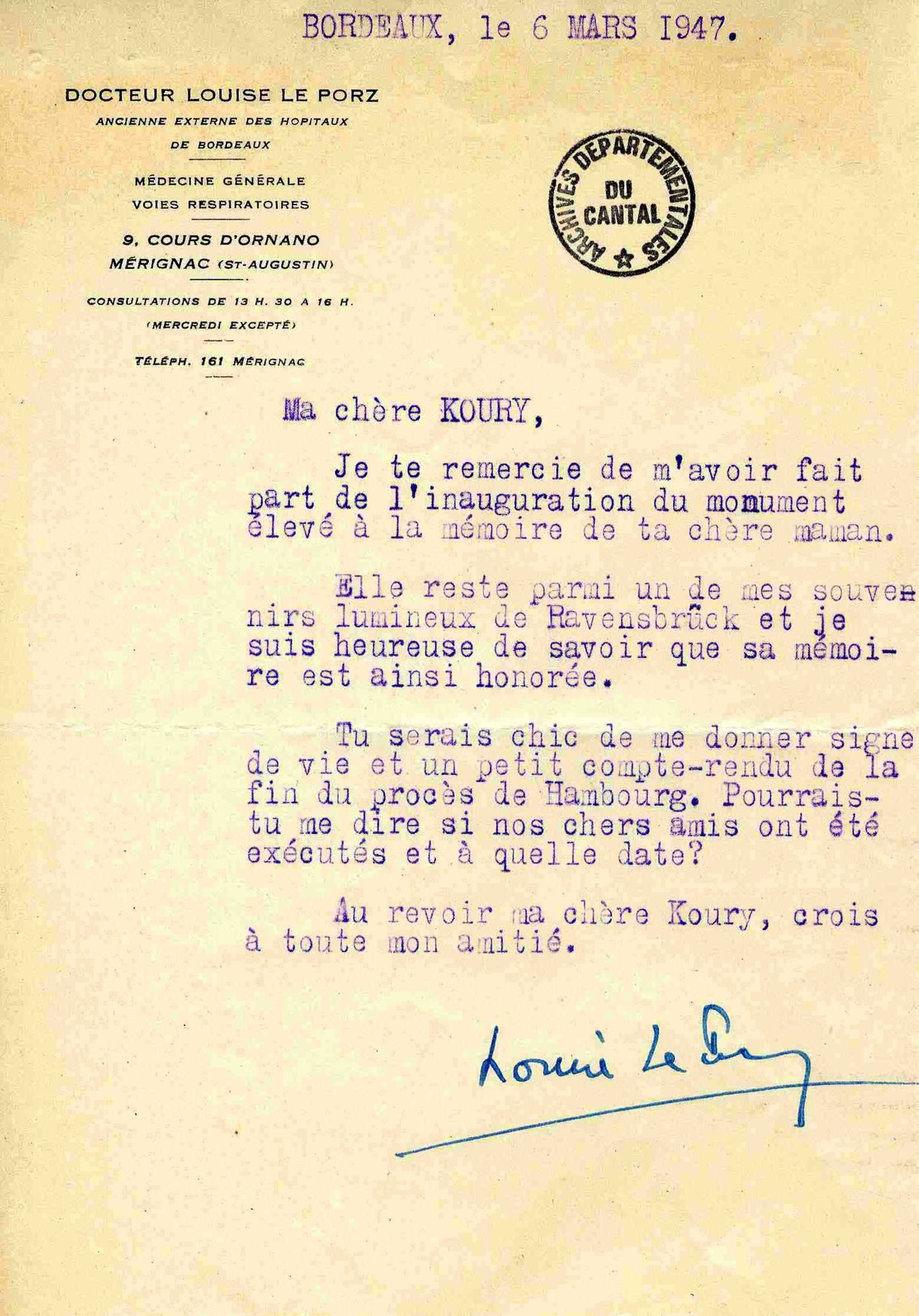 « Cette noble femme, symbole de courage, tranquille d’abnégation, d’amabilité toujours souriante, est une figure que n’oublieront jamais les personnes qui l’ont connue » (Marie-Jeanne Stout). « J’ai passé huit jours dans sa cellule à la Santé, temps qui a passé beaucoup trop vite car nous avons discuté de mille choses, littérature, musique, etc. qui nous transportaient très loin en dehors des murs de la prison » (May Renault, sœur du « colonel Remy). « Elle reste parmi un de mes souvenirs lumineux de Ravensbrück et je suis heureuse de savoir que sa mémoire est ainsi honorée. Tu serais chic de me donner signe de vie et un petit compte-rendu de la fin du procès de Hambourg. Pourrais-tu me dire si nos chers amis ont été exécutés et à quelle date ? » (Docteur Louise Le Porz). « Rescapés des bagnes, nous pouvons apprécier mieux que quiconque toute l’épouvantable tristesse des morts de là-bas et toute la considération que nous devons avoir pour ceux qui, quel que fut leur âge, ont résisté aux barbares » (A. Goupille). « Je l’ai bien connue au [bloc] 15, j’habitais sa rangée de lit, elle était bien patiente et me souriait quand je m’excusais de la déranger si souvent en passant, je ne pensais pas qu’elle avait cet âge, pauvre dame ! » (L. Maireau). « Je suis si heureuse et si fière d’avoir connu ta chère maman ! Je ne puis oublier sa rayonnante personnalité, ni les petites conférences clandestines qu’elle avait organisées pour que je puisse parler du ‘Casabianca’ de mon cher grand frère » (Jeannette L’Herminier). « J’étais souvent à côté de la maman Tillion pendant les appels et nous parlions longuement. J’étais au block 15, puis 27, puis 32, matricule 47.288 » (Marcelle Lebourgeois).