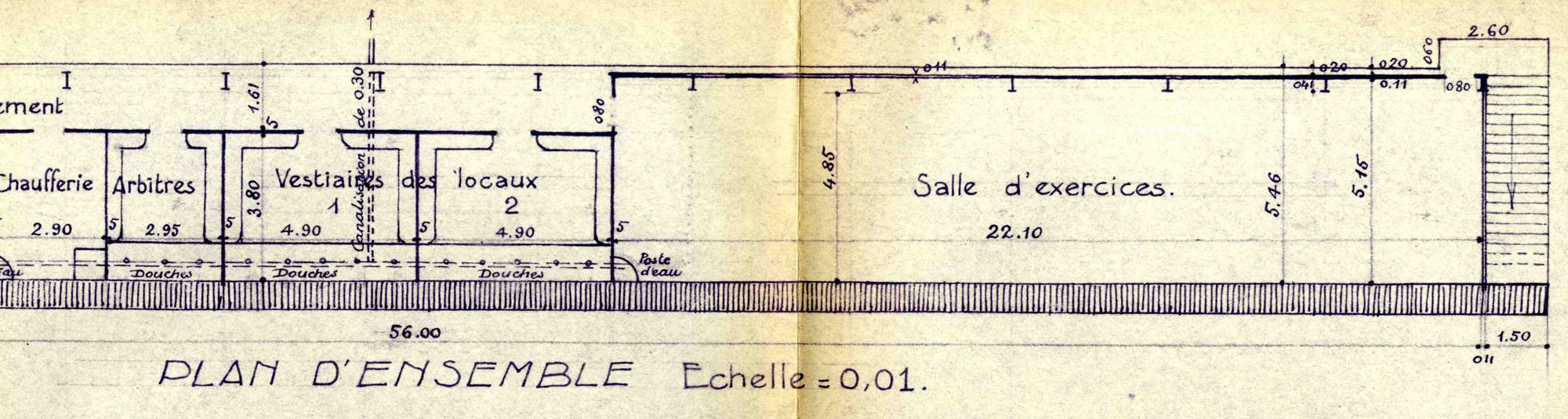 Le sous-sol comprend bureaux, vestiaires, douches et W.-C. (« 23 pommes de douches, 23 robinets pour le lavage des pieds et 5 postes d’eau ») ; ces installations sanitaires, modernes en 1935, jugées rustiques au début des années 1980, furent alors modernisées.