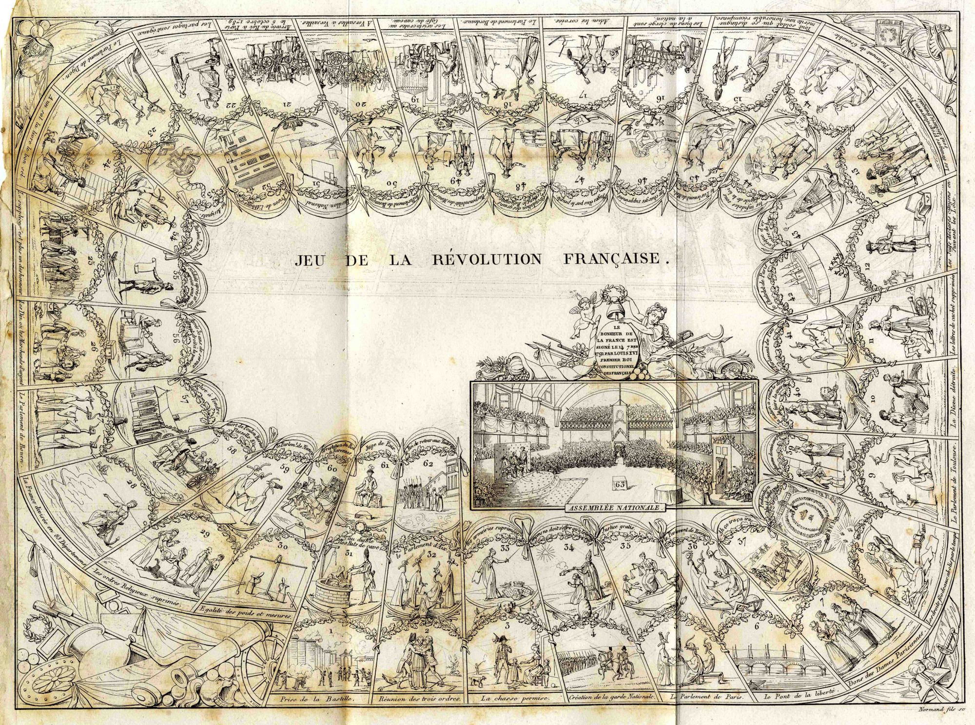 Apparu aux alentours du XVIe siècle, le jeu de l’oie n’a cessé de séduire les joueurs grâce à ses règles simples mais permettant de nombreux rebondissements. Bien souvent, les artistes le dessinant ont laissé libre cours à leur imagination, visant l’originalité ou cherchant à illustrer un thème précis. C’est ce que l’on observe dans ce jeu de la Révolution française gravé par Louis-Marie Normand (1789-1874) d’après un dessin datant probablement de 1791.