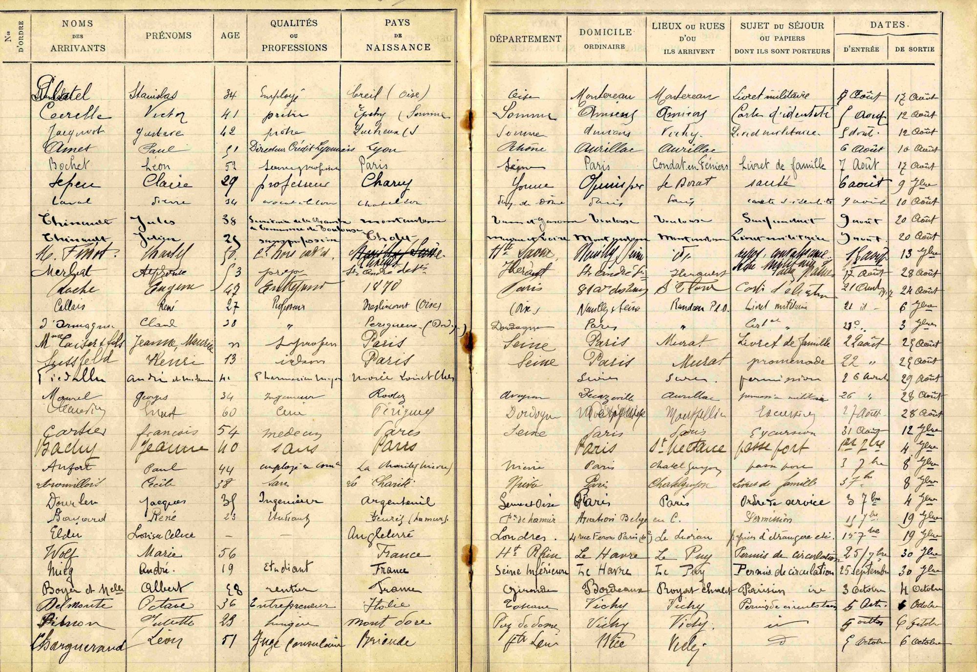 Comme on peut s’y attendre, les personnes fréquentant l’hôtel font majoritairement partie des classes aisées de la société : médecins, négociants, rentiers, hommes de lettres, etc. Mais on trouve également quelques professions qui sortent du rang : un mécanicien, un serrurier, quelques prêtres, un vicaire et un secrétaire-archiviste. Loin des combats de la guerre, l’hôtel voit également apparaître à partir de 1916 les premiers permissionnaires venus se ressourcer. Fernand Grisel, interprète de 37 ans, passe ainsi 4 jours en mai en compagnie de sa femme. Ce fut un séjour au grand calme : à cette période de l’année, ils sont les seuls pensionnaires de l’hôtel !