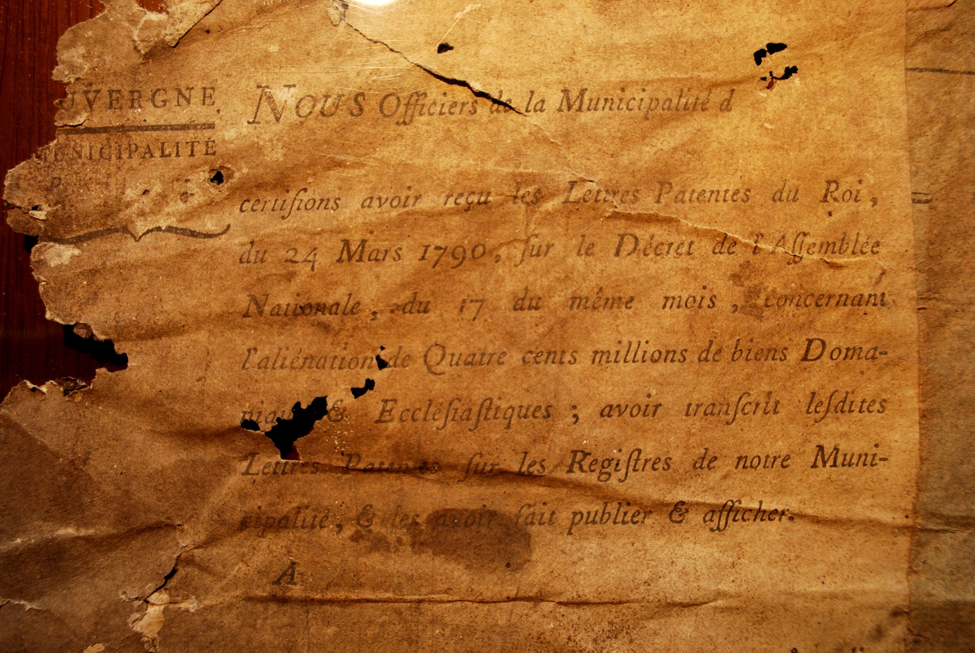 - Papier composant le marouflage réalisé autour de 1800 : il s’agit d’un formulaire de 1790 à renvoyer par les municipalités. Le texte est le suivant : « NOUS Officiers de la Municipalité de … certifions avoir reçu les Lettres Patentes du Roi du 24 Mars 1790, sur le Décret de l’Assemblée Nationale du 17 du même mois, concernant l’aliénation de Quatre cents millions de biens Domaniaux & Ecclésiastiques, avoir transféré lesdites Lettres Patentes sur les Registres de notre Municipalité & les avoir fait publier & afficher. »