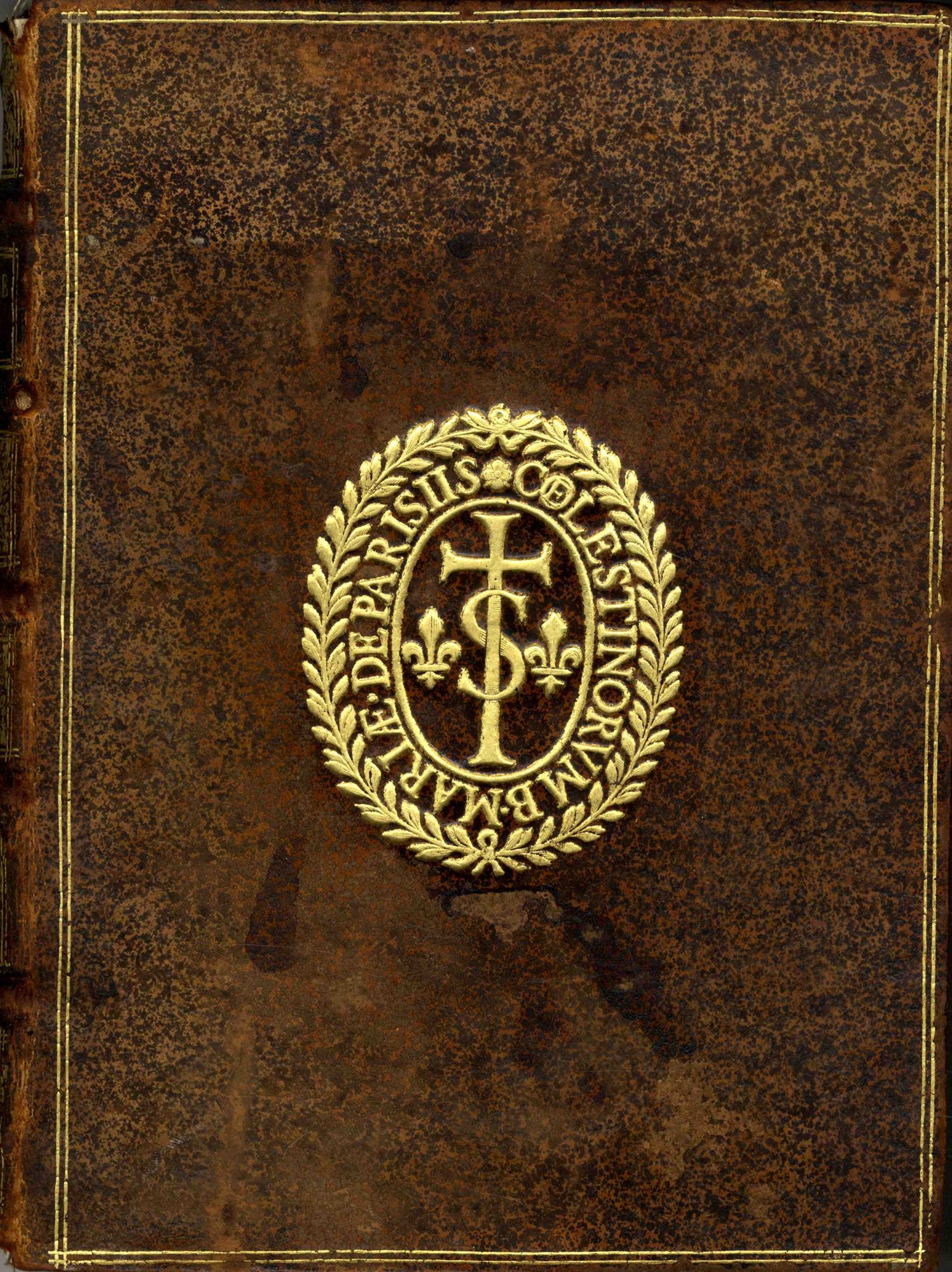 Le Spicilegium est un recueil érudit compilé par les bénédictins de la congrégation de Saint-Maur. Les Archives du Cantal ne conservent qu’un volume isolé, le tome 13, édité en 1676. La page de titre comporte l’ex-libris manuscrit « Coelestinorum Parisiensium » (Des Célestins de Paris), confirmé par le très beau médaillon doré figurant sur les plats : un écu à une croix dans laquelle est entrelacé un « S », accostée de deux fleurs de lis, entouré d’une légende « COELESTINORUM B[EATAE] MARIAE DE PARISIIS » (Des Célestins de Notre-Dame de Paris) le tout dans une couronne de laurier. Il s’agit des armoiries de cet ordre de tendance érémitique fondé par Pierre de Morrone, pape sous le nom de Célestin V en 1294, d’où le nom que prit l’ordre. Le Spicilegiumprovient du couvent parisien, dont l’église fut détruite en 1795 et les bâtiments conventuels, en 1877 ; la caserne des Célestins (Gardes républicains) garde le souvenir de ce couvent, qui fut fermé dès 1778 à la suppression de l’ordre. Les collections en furent alors dispersées, et un tome dépareillé arriva à Aurillac.