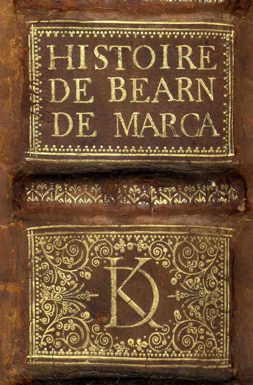 L’Histoire de Béarn, de Pierre de Marca, est publiée à Paris en 1640. Au centre des compartiments situés entre les nerfs figurent, entrelacées, les lettres « K » et « D », sans qu’il soit possible de déterminer à qui renvoie ce chiffre formé d’initiales, ni qui désigne l’écu à une fleur de lis figurant, en or, sur chacun des deux plats.