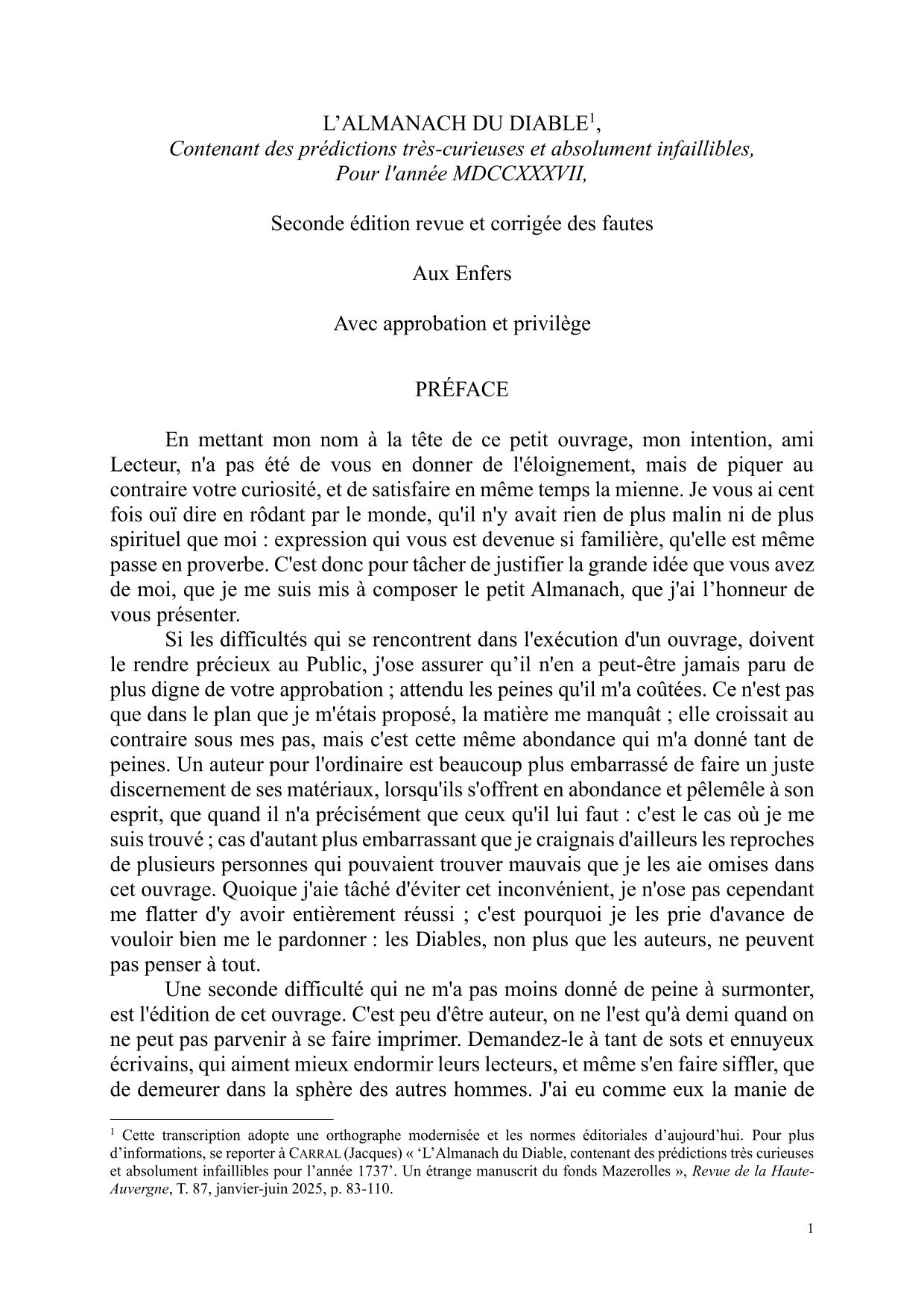 L’Almanach est composé à la manière d’un ouvrage imprimé classique. Il commence par une préface de l’auteur où ce dernier détaille l’objectif qu’il poursuivait et les difficultés qu’il a rencontrées lors de la rédaction de son œuvre, sans oublier d’introduire quelques jeux de mots : le risque de vexer certaines personnes qu’il aurait malencontreusement omis de citer, et la question de trouver une imprimerie où tirer le recueil. Celle des Nouvelles ecclésiastiques, revue janséniste clandestine, aurait pu convenir, « mais où diable la trouver ? ». La solution finit par s’imposer : le Seigneur Lucifer aura sa propre imprimerie, et notre diable d’auteur parvient à obtenir un « permis d’imprimer et de colporter » ainsi qu’une « approbation authentique de diablerie », reproduits à la suite de la préface. L’auteur termine sur une note bien sensée pour un diable, qui laisse entrevoir une appréhension toute humaine quant à la manière dont sera reçu le texte : « Quand on a aimé à rire des autres, il faut souffrir à son tour qu’ils rient de nous. La moitié du monde, comme vous le sçavez, se moque de l’autre, et le sage rit de tout ».