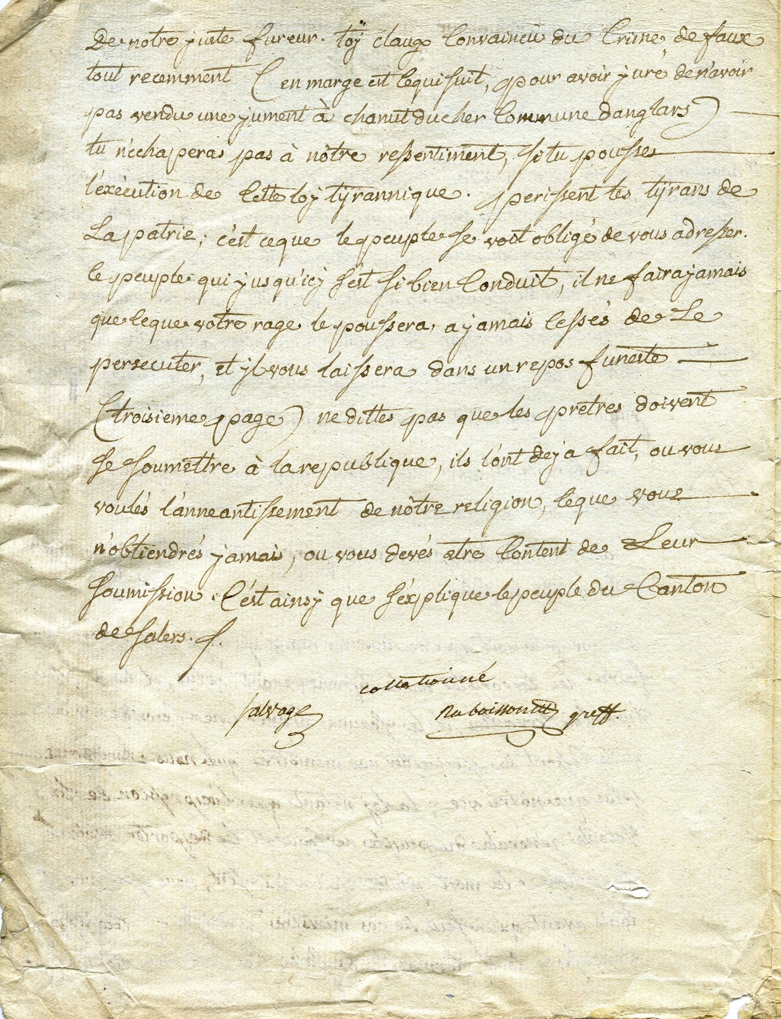 La colère de ces hommes et de ces femmes se tourne aussitôt vers les symboles de la République. Très attachés à leur religion dont on avait tenté de les priver, et à leurs curés, qui revêtent bien plus qu’une simple autorité spirituelle, des habitants de Saint-Bonnet-de-Salers et de Salers prennent d’assaut la maison du maire de Salers, Raymond Claux, le 11 brumaire dans la soirée, et exigent que ce dernier leur remette ses armes. C’est sans doute à cette occasion que la lettre anonyme est déposée. Elle sera ensuite transmise au greffe de la police de sûreté du canton de Salers, qui la transcrira dans ses registres. Cette lettre laisse transparaître des sentiments très forts : le clergé s’est soumis une première fois au serment, il n’est plus question de se laisser faire et de risquer de le perdre une nouvelle fois. Il est clair, dans cette lettre, que les prêtres ne sont pas à l’origine de cette rébellion. C’est un mouvement qui vient du peuple, le « peuple du canton de Salers », prêt à se sacrifier pour ses curés. Mais les victimes peuvent également se faire bourreau, et menacer le maire s’il fait exécuter le décret : « Périssent les tyrans de la Patrie ! »