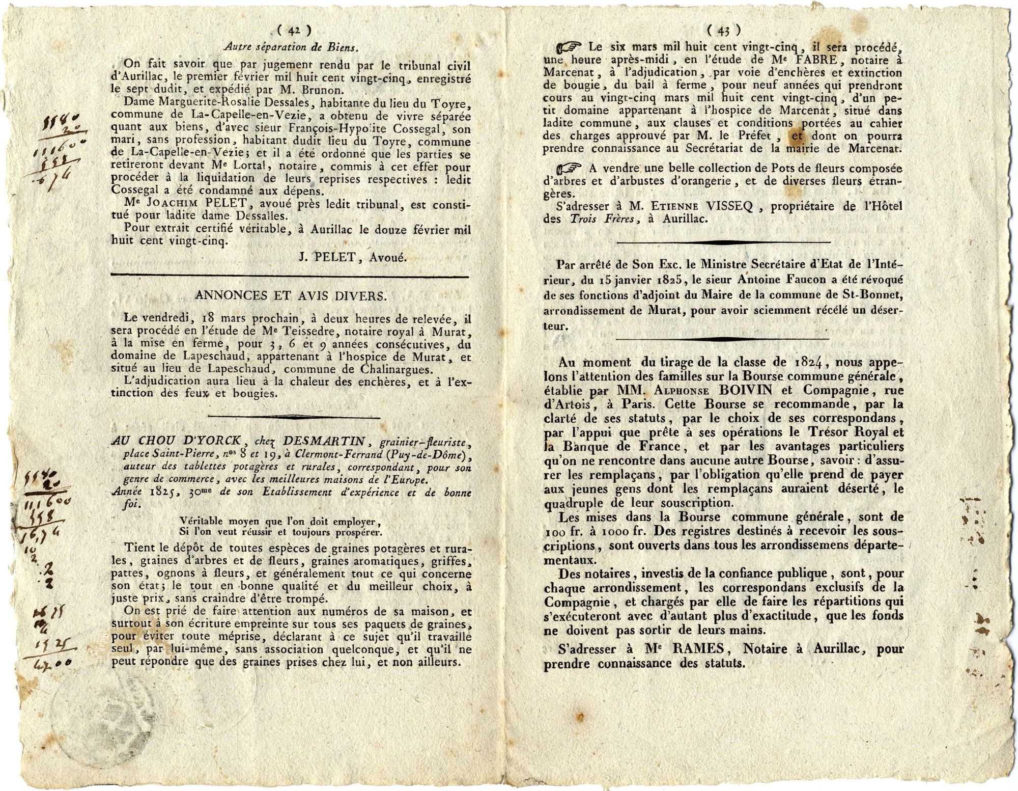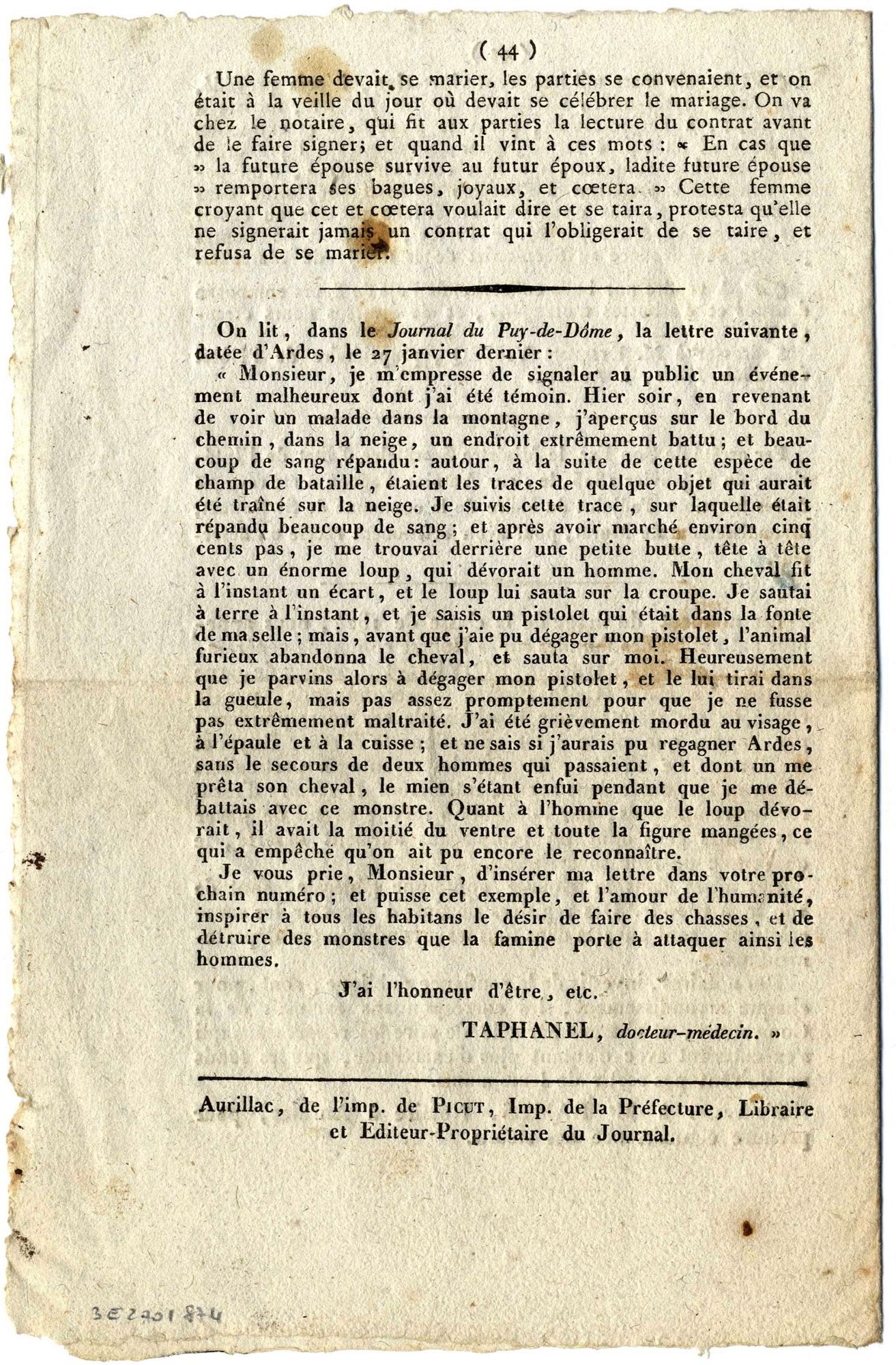 Quoi qu’il en soit, cette enchère nous amène à un autre document contenu en annexe, permettant aux administrateurs de l’hospice de justifier que la publicité autour de cette adjudication a bien été faite. Des affiches ont été posées à Chalinargues et dans les communes environnantes le mois précédent, et une annonce publiée dans le Journal d’annonces judiciaires et avis divers qui se publient dans le département du Cantal du 12 février 1825, journal dont les Archives départementales ne possèdent pas une collection complète. Deux exemplaires de ce petit bulletin (une feuille de 27 x 21 cmpliée en deux) sont insérés dans l’acte. On y apprend la séparation de biens entre Pierre Bastide, marchand en Espagne, et son épouse Rose Vigier, sans doute exaspérée d’avoir vu sa dot engloutie dans les frais du commerce de son époux, la publicité d’un grainier-fleuriste clermontois « correspondant, pour son genre de commerce, avec les meilleurs maisons de l’Europe » et marquant à la main tous ses paquets de graines, une autre d’un courtier boursier de Paris, ou encore une petite annonce d’un hôtel aurillacois proposant non pas des chambres, mais des pots de fleurs. Quant à la dernière page, elle est consacrée à deux anecdotes. La première fait office d’histoire drôle, basée sur un jeu de mots apparaissant dans diverses publications quelques années auparavant ; son authenticité paraît douteuse. La seconde en revanche a véritablement été publiée dans le Journal du Puy-de-Dôme et soulève un problème assez important pour que le département voisin s’en inquiète : la présence d’un loup dévoreur d’hommes signalée par le médecin Taphanel, d’Ardes[-sur-Couze], lui-même victime de cette bête (âmes sensibles, s’abstenir).