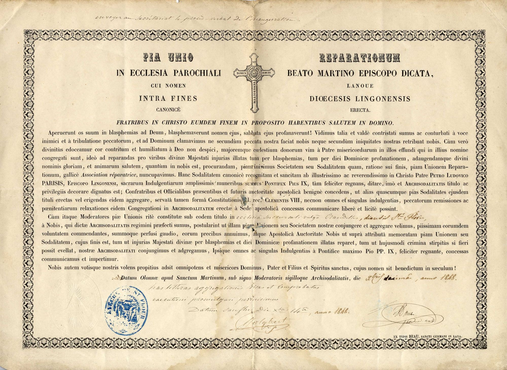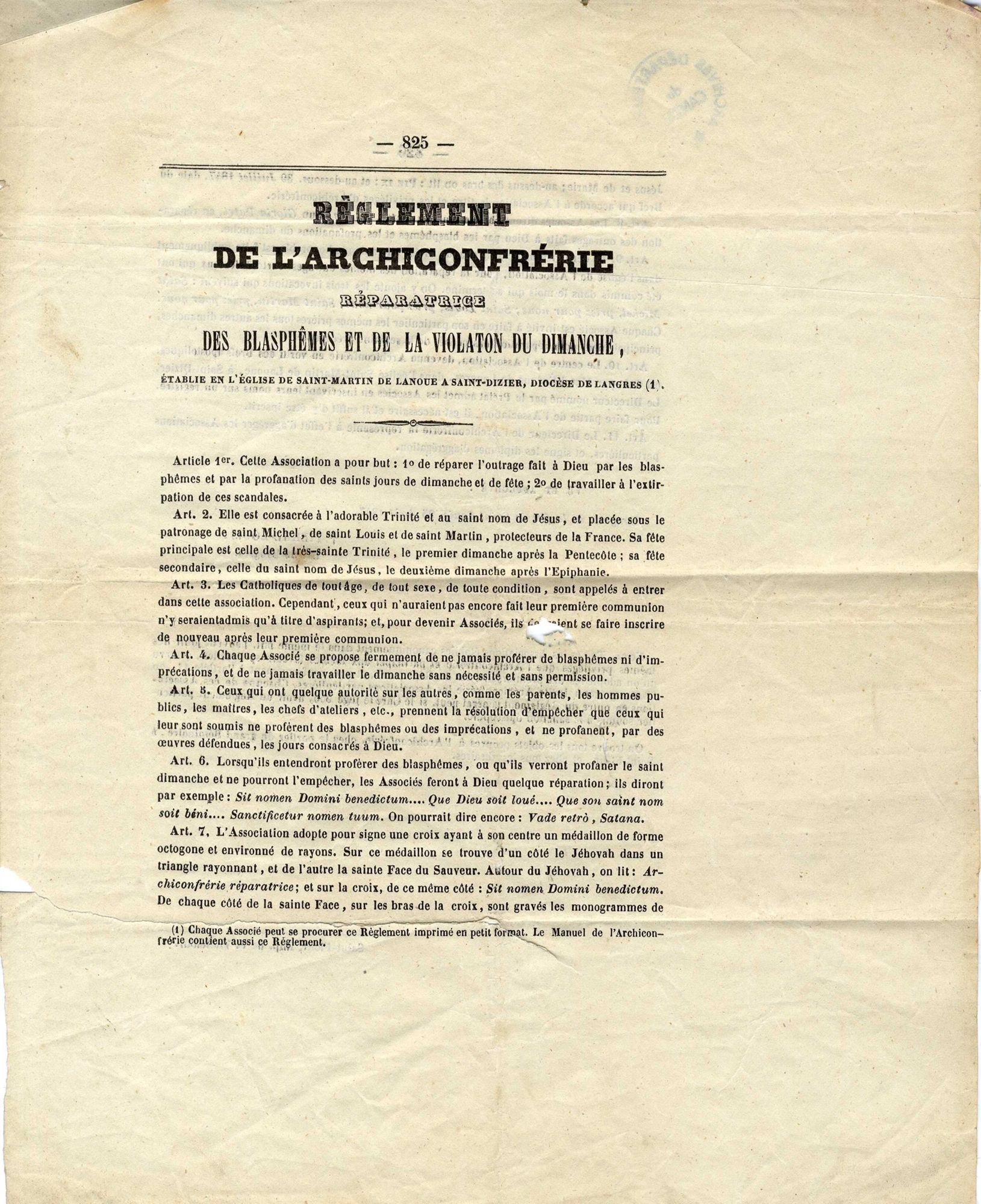 Diplôme d’agrégation de l’Association réparatrice des blasphèmes et de la violation des dimanches (1848)