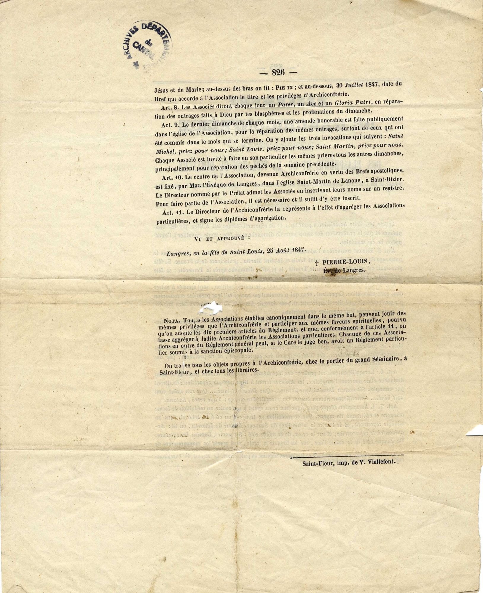 Village cantalien de moins de 800 âmes, Crandelles est loin d’être le plus touché par la dictature des grands industriels sur le rythme traditionnel de la semaine. Mais il faut croire que les Crandellois se font du souci pour les ouvriers, et qu’ils exècrent en outre les blasphèmes. C’est pourquoi le 3 décembre 1848 est inaugurée, lors de la messe du premier dimanche de l’Avent, l’Association réparatrice des blasphèmes et de la violation du dimanche. Il ne s’agit pas d’une invention crandelloise, le mérite en revenant à l’église Saint-Martin de Lanoue à Saint-Dizier en Haute-Marne. Erigée par le pape Pie IX en archiconfrérie, l’Association réparatrice de Saint-Dizier bénéficie d’indulgences et de rémission des péchés, et est autorisée à s’unir à d’autres associations semblables, qui profiteront à leur tour de ces indulgences. C’est ce que demande l’association de Crandelles, qui obtient en retour ce diplôme d’agrégation à l’archiconfrérie, approuvé par le vicaire général du diocèse de Saint-Flour le 14 décembre 1848.