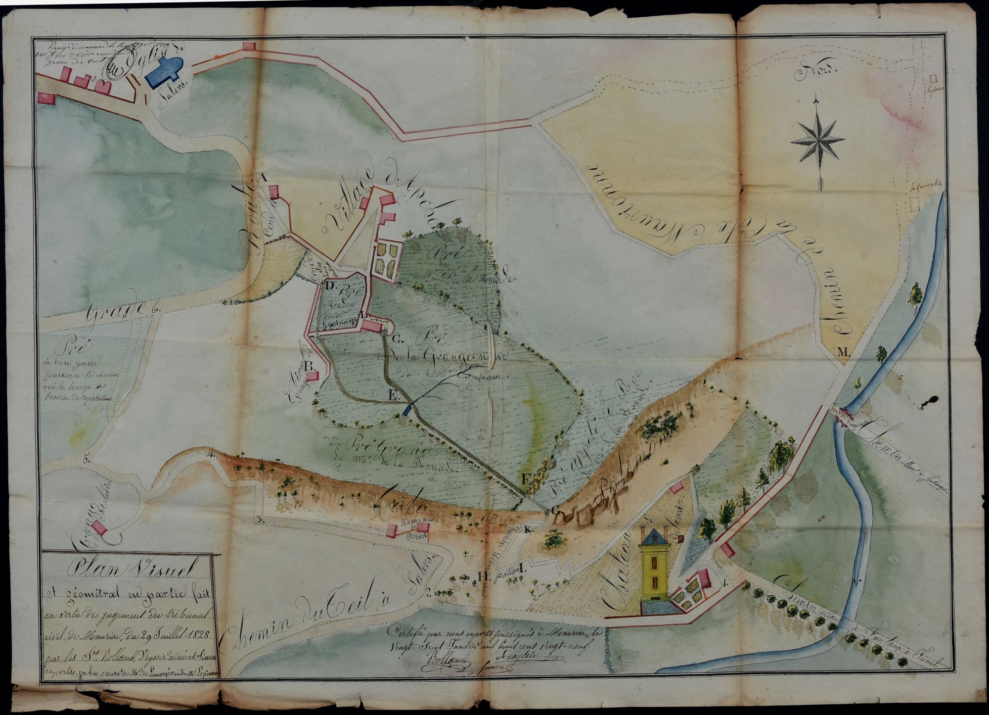 Le document exposé, daté de 1828, est un exemple parmi d’autres de ces plans aquarellés effectués avec soin par les géomètres chargés par un juge d’élucider un contentieux. Dans notre cas, il s’agit d’une querelle de voisinage, comme souvent, entre une grande famille locale représentée par Gabriel Barthélémy Salvaige de Lamargé, et le sieur André Espinasse.