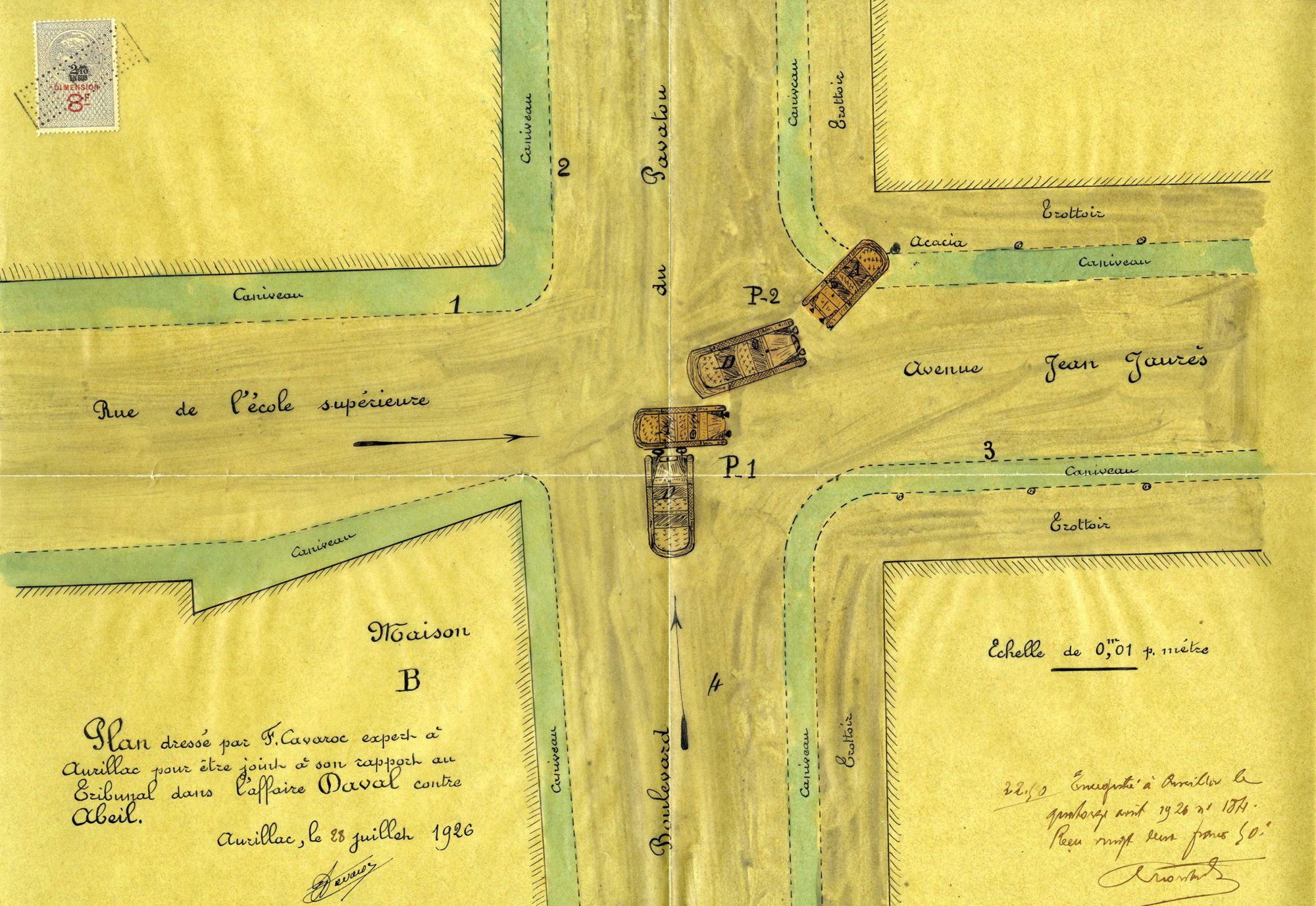 Lors du classement des archives du tribunal civil d’Aurillac, il a été découvert un rapport d’expert du 28 juillet 1926 concernant l’affaire Daval contre Abeil, suite à un accident de la circulation survenu le 5 juillet précédant, au carrefour de l’avenue Jean-Jaurès et du boulevard du Pavatou. Mandaté par le président du tribunal, le géomètre-expert F. Cavaroc fut chargé d’enquêter sur cet accrochage et d’en déterminer les causes et les circonstances.