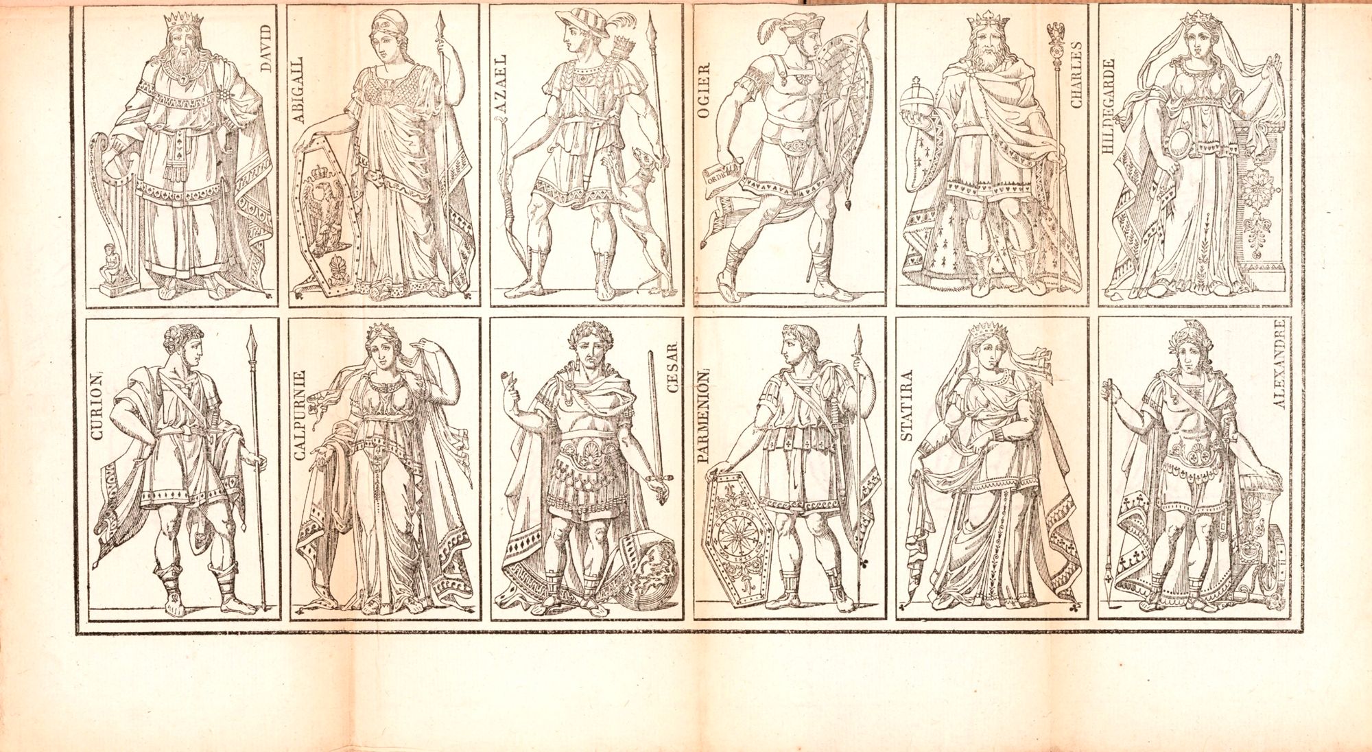 Les rois choisis pour être représentés sur ces cartes figurent encore traditionnellement sur nos jeux actuels : il s’agit du roi David, de Charlemagne, de Jules César et d’Alexandre le Grand. Tous les quatre sont cités parmi les Neuf Preux, neuf héros païens, bibliques et chrétiens considérés comme des modèles de chevalerie. Les dames en revanche sont tombées dans l’oubli. Leur place dans ce jeu était pourtant justifiée puisqu’elles sont les femmes respectives des rois cités. Les valets sont quant à eux leurs compagnons ; seul Ogier, personnage de la Chanson de Roland, est demeuré sur les cartes du siècle suivant.