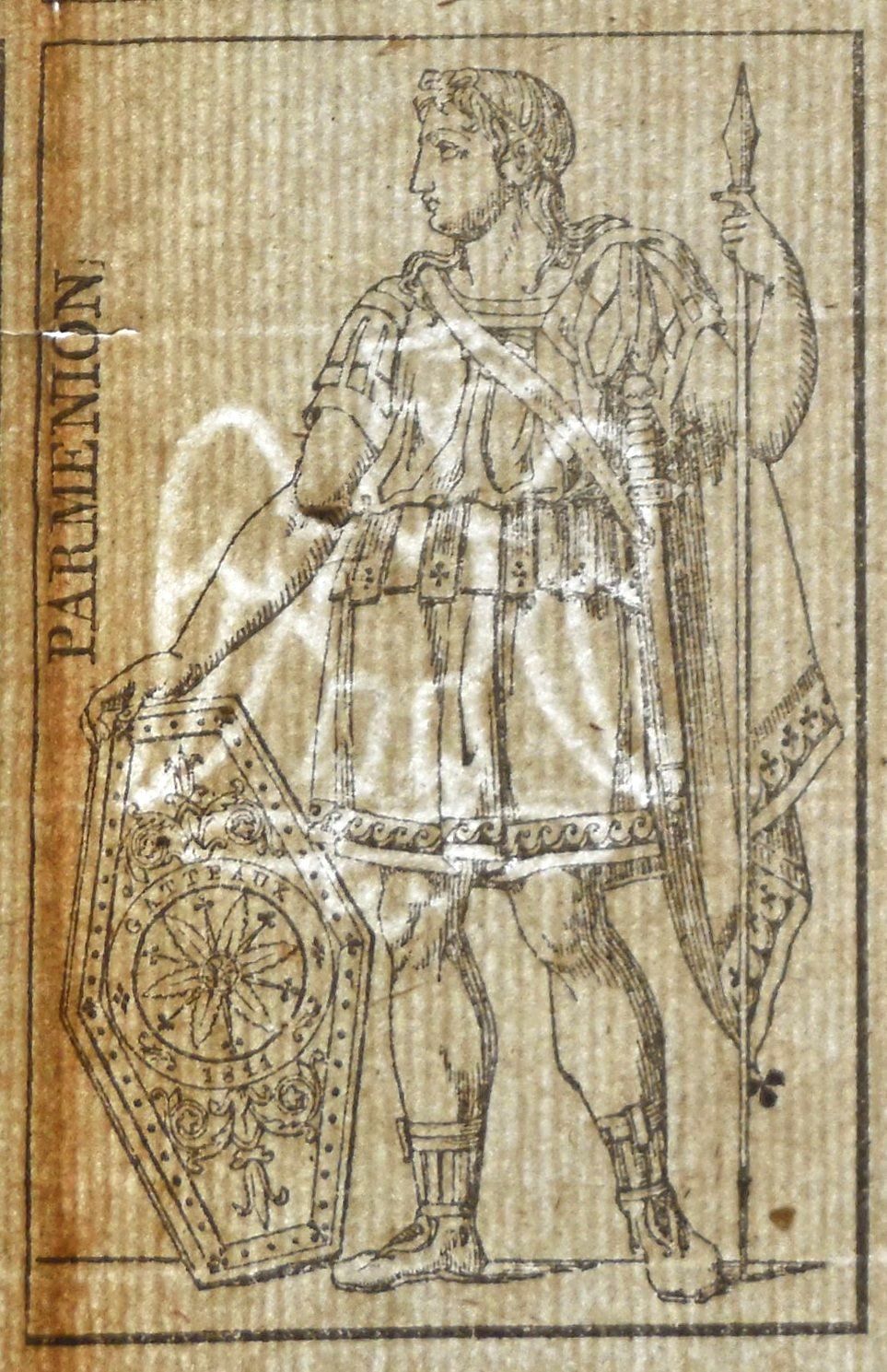 L’intermède révolutionnaire abolit temporairement cet impôt au nom de la liberté, et bouleverse en même temps l’iconographie des cartes puisque tous les symboles de la royauté sont bannis et remplacés par des génies, des libertés et des égalités. Ceux-ci font cependant leur réapparition peu après, avec une volonté d’uniformisation : Napoléon décide en 1808 que toutes les figures seront identiques partout en France. Au-delà d’un contrôle plus facile à appliquer, il s’agit de mettre fin aux figures régionales (chaque province avait ses rois) en unifiant les représentations, symbolisant ainsi l’unité de l’Empire. Il confie au peintre Jacques-Louis David la réalisation de nouveaux personnages dont la qualité du dessin les rendrait difficiles à imiter. N’ayant pas les faveurs du public, ce jeu est abandonné et Nicolas Gatteaux, graveur reconnu, en propose un nouveau en 1811, qui est représenté ici : la signature du dessinateur figure sur le bouclier du valet Parmenion. Ce modèle sera légèrement modifié deux ans plus tard avant d’être définitivement mis en circulation.
