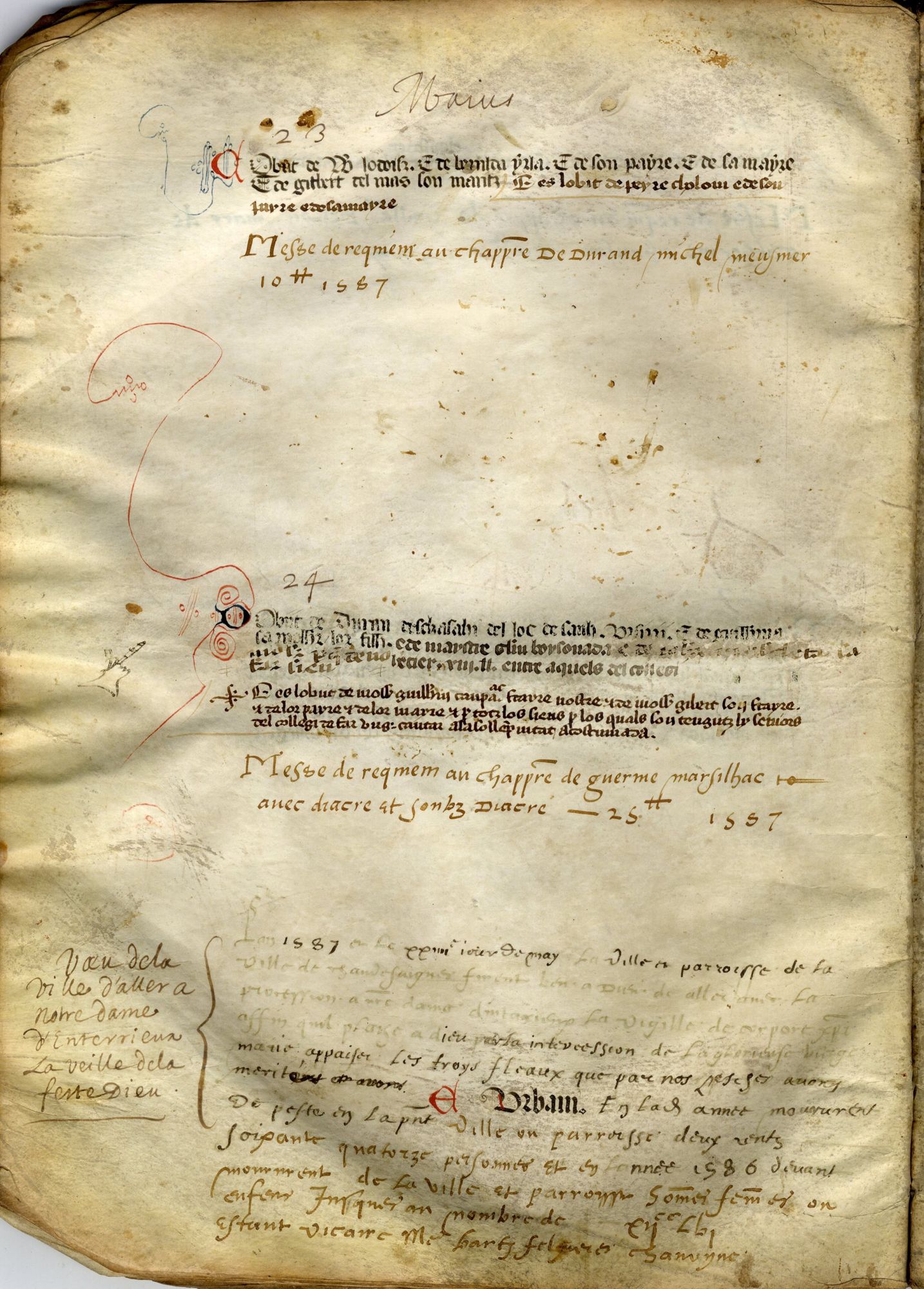 La peste – ou toute autre épidémie non identifiée, que l’on désignait ainsi – ne s’est d’ailleurs pas cantonnée qu’au XIVesiècle. L’un des rédacteurs, profitant d’un espace blanc en bas de page (page de gauche du registre exposé), témoigne d’un pèlerinage à Anterrieux, à environ 6 km de Chaudes-Aigues, organisé pour faire cesser l’épidémie : « L’an 1587 et le XXIIIe jour de may, la ville et parroisse de la ville de Chaudesaigues firent veu à Dieu de aller avec la procession a Notre Dame d’Antarieux la vigille de corpore Christi [la veille de la Fête-Dieu, qui a lieu 60 jours après Pâques] affin qu’il plaise à Dieu par la intercession de la glorieuse Vierge Marie appaiser les troys fléaux que par nos peschés avons mérités. En ladite année moururent de peste en la present ville ou parroisse deux centz soixante quatorze personnes et en l’année 1586 […] jusques au nombre de 1256 ». Les deux autres fléaux ne sont pas précisés ; il pourrait s’agir du mauvais temps et de la famine.