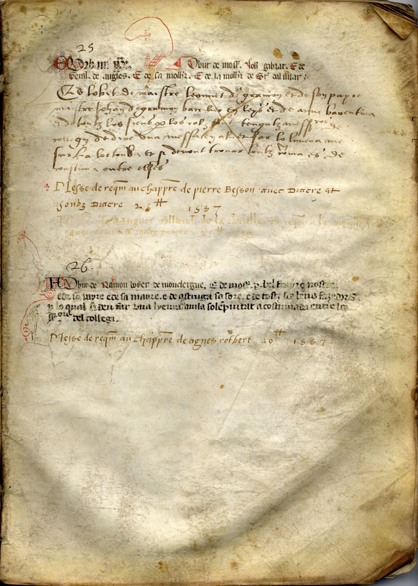 Ainsi s’explique la variété des écritures : commencé semble-t-il au XIIIe siècle, en occitan, cet obituaire fut complété au fil des ans par les prêtres successifs, jusqu’à la toute fin du XVIesiècle, en français. Ce n’est que tardivement que l’année du legs est précisée par le scribe : les premières mentions ne permettent pas de dater avec précision le registre, dont les premières pages sont manquantes.