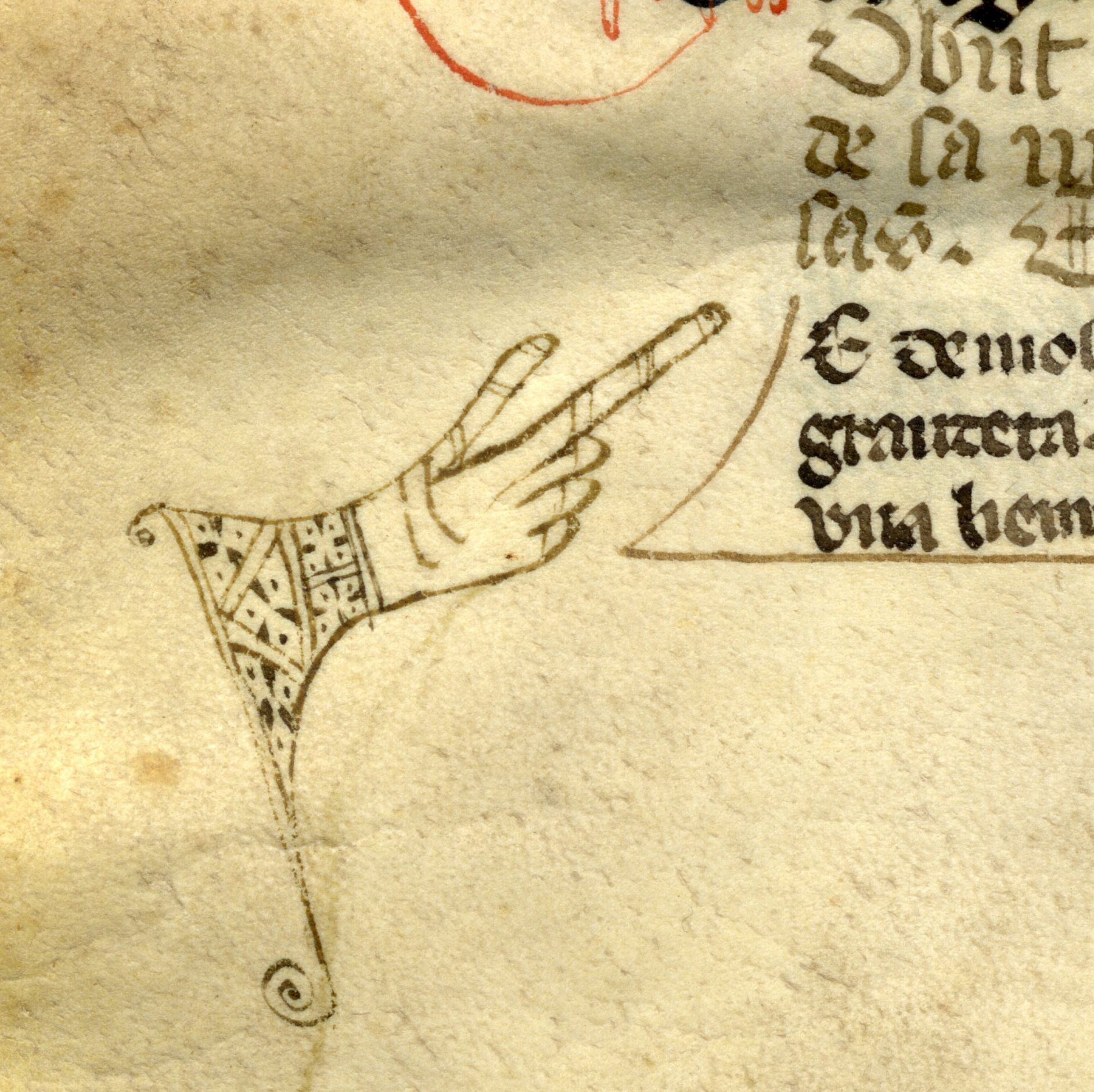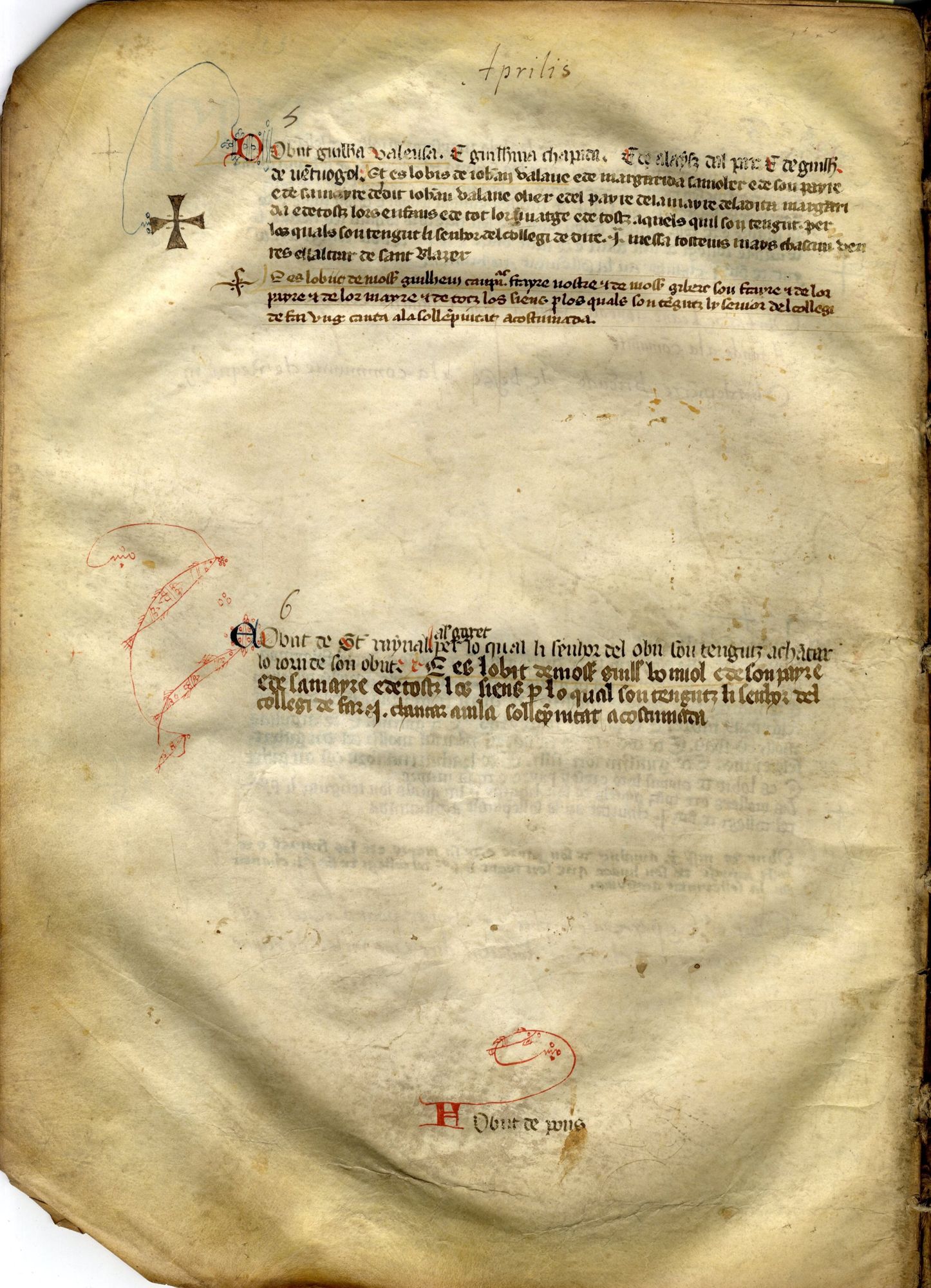Conformément à l’habitude des copistes médiévaux, l’obituaire est agrémenté de couleurs : des traits rouges rehaussent certaines lettres, et des fioritures rouges et bleues jaillissent des initiales de chaque paragraphe. Ces initiales, de A à G, étaient à l’origine les seuls repères signalant le passage d’un jour à l’autre. Le quantième au-dessus de chaque paragraphe et le nom du mois en haut de la page (« Maius », mai en latin) sont d’une écriture plus tardive et ont donc été ajoutés après, dans un souci pragmatique tout à fait compréhensible. Des petites mains à l’index tendu signalent des noms sans doute jugés importants. Les autres décors sont peu nombreux. On remarquera cependant l’heureuse intuition du scribe qui, sans connaître notre actuelle tradition, a placé au début du quatrième mois de l’année de beaux poissons d’avril.