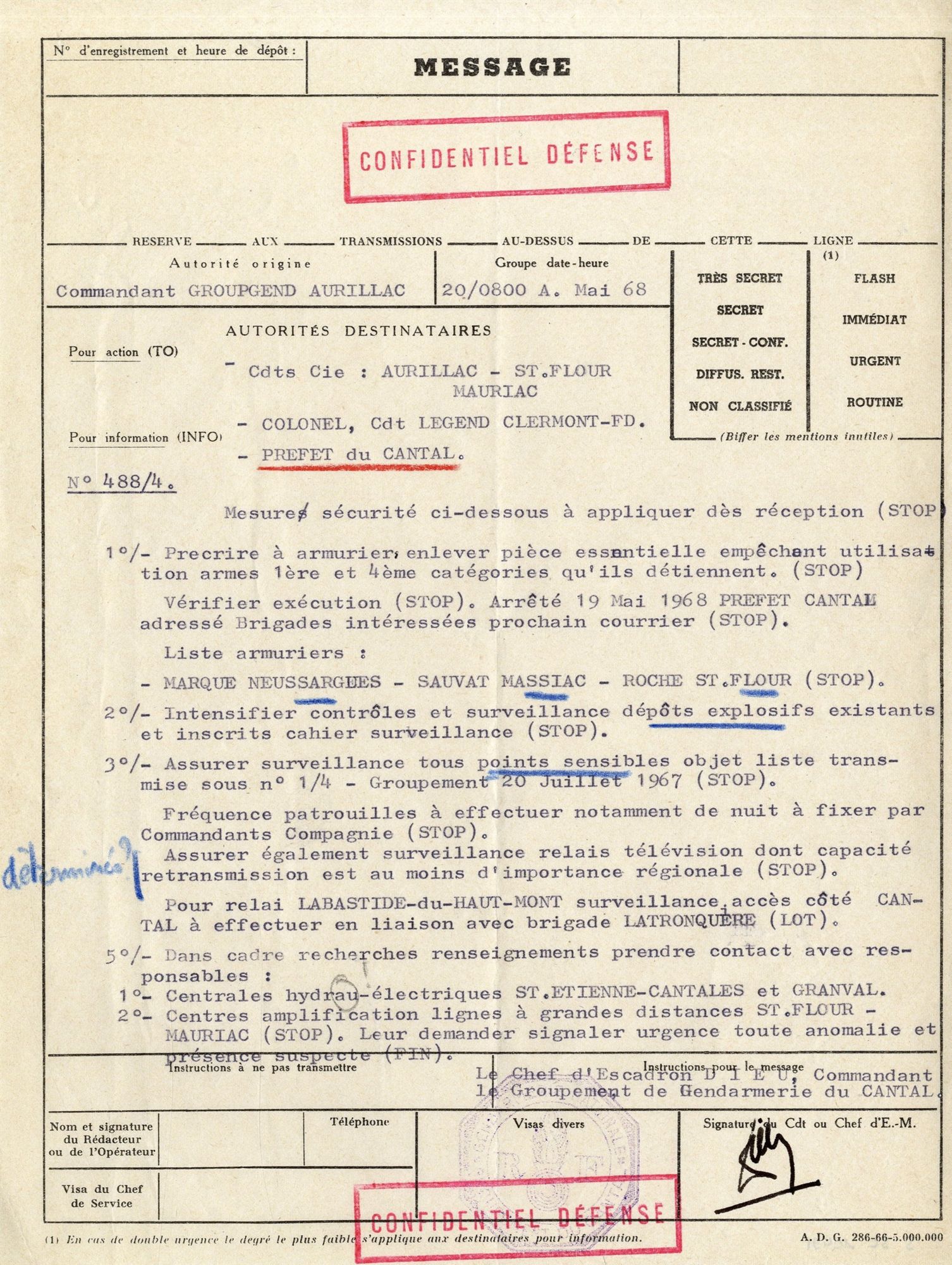 Rapidement, le Gouvernement prend au sérieux le risque que présente un mouvement de contestation générale pour la sécurité du pays. Suivant les ordres du ministère de l’Intérieur arrivés le 18 mai, le commandant du groupement de gendarmerie du Cantal transmet aux commandants des compagnies d’Aurillac, de Saint-Flour et de Mauriac ce télégramme « confidentiel défense » listant les mesures de sécurité à appliquer. Celles-ci visent en premier lieu à empêcher les manifestants de se procurer des armes. Ainsi, il est enjoint aux armuriers de rendre inutilisables toutes les armes à feu, de poing ou longues, qu’ils détiennent : au cas où un magasin serait pillé, les armes ne pourront pas être tournées contre les forces de l’ordre ou les citoyens. Les dépôts d’explosifs (utilisés notamment dans les carrières) sont placés sous surveillance étroite pour la même raison. Les relais de télévision ne sont pas négligés, sans doute pour garder le contrôle de l’information qui circule.