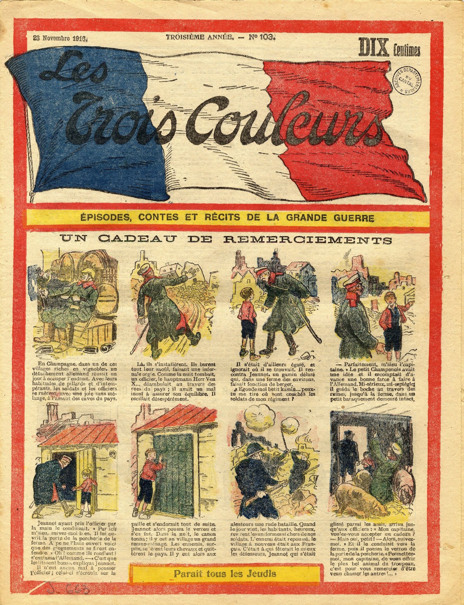 En ce mois du Festival BD du Bassin d’Aurillac, intéressons-nous aux plus anciennes bandes dessinées conservées aux Archives départementales. Il semble que la palme revienne à l’hebdomadaire Les Trois Couleurs, journal à destination des enfants publié à partir de décembre 1914.