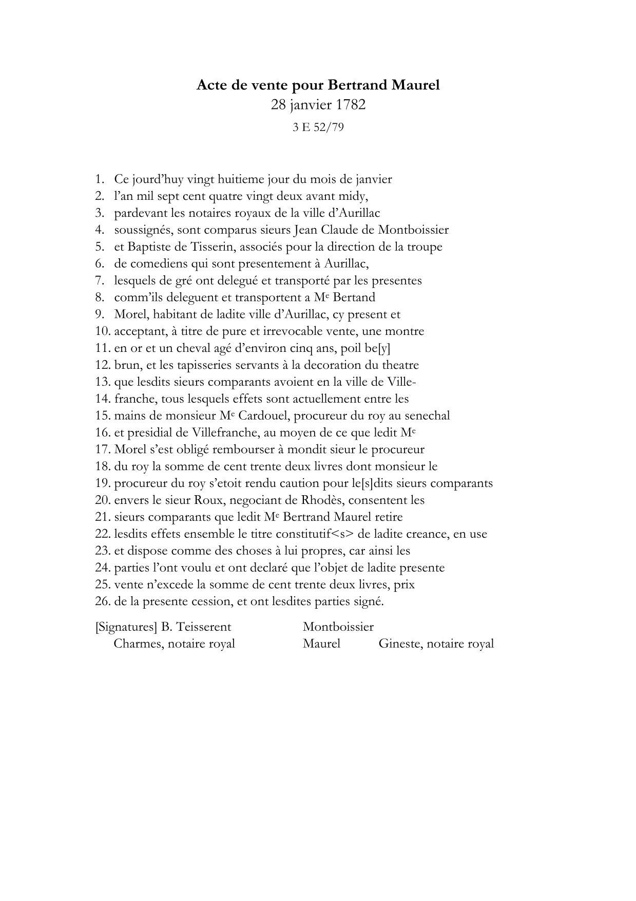 C’est donc sans décor que la troupe se dirige vers Aurillac pour trouver un moyen de rembourser son nouveau créancier. La solution se présente sous la forme d’un acte de vente des biens laissés en caution à Me Cardouel, dont un certain Bertrand Maurel, habitant de la ville d’Aurillac, se porte acquéreur. Passée devant les notaires Geneste et Charmes le 28 janvier 1782, la minute est signée par l’acheteur et les deux vendeurs. On remarquera que Montboissier orne sa signature d’un symbole maçonnique approximatif : cinq points, au lieu de trois, placés entre deux traits horizontaux.