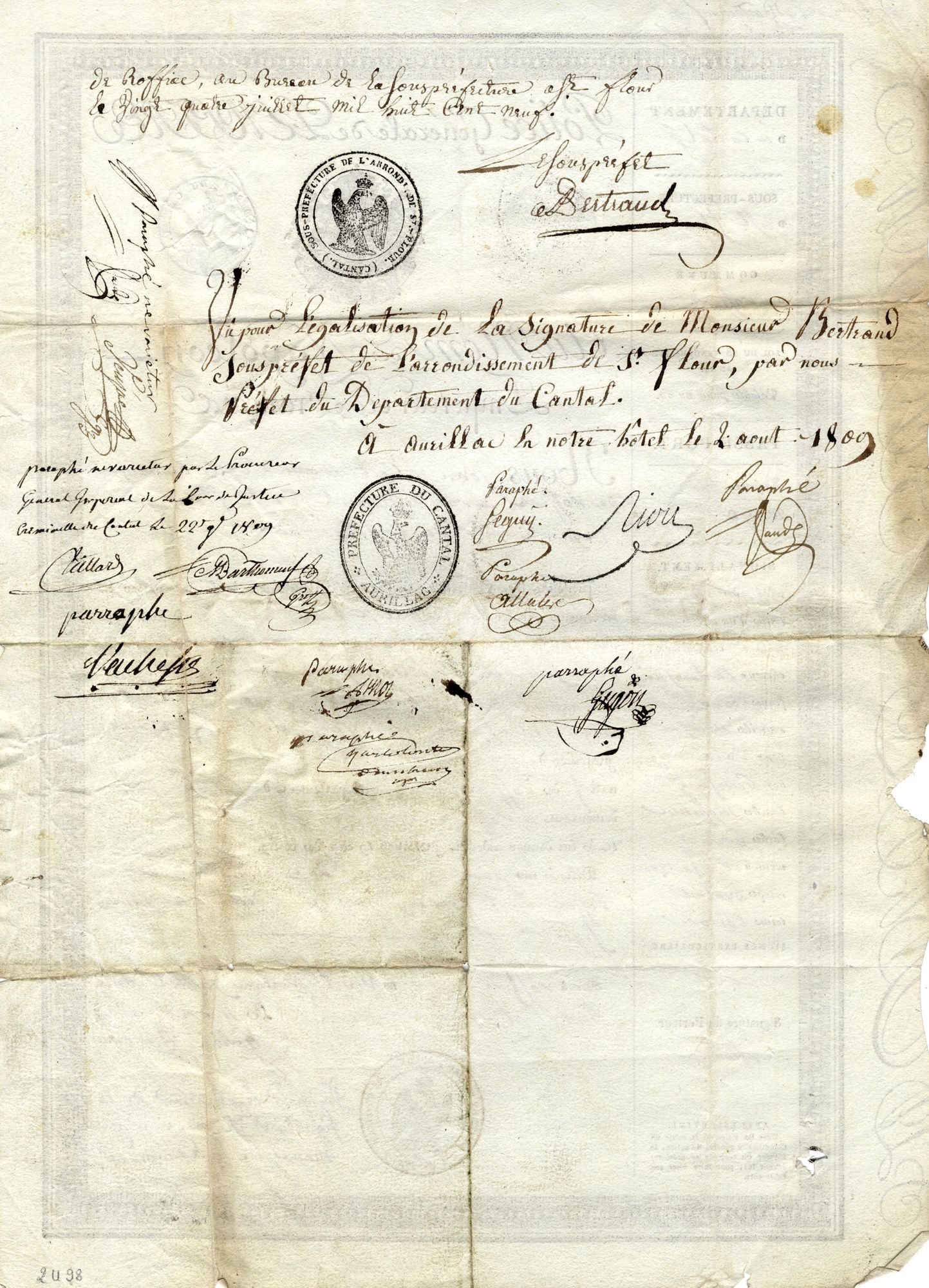 Imprimé sur parchemin, il s’agit d’un formulaire complété à la main, mais sa taille, les caractères typographiques raffinés ainsi que les signatures en imposent. Le sceau, quant à lui, est un timbre sec imprimé en relief au bas du parchemin et représentant l’aigle impérial ; il est presque invisible. Lues en audience publique de la cour de justice criminelle de Saint-Flour en présence du condamné, ces lettres ont ensuite été ajoutées au dossier de procédure au lieu d’être remises à l’intéressé et sont ainsi parvenues dans les fonds des Archives départementales, après quelques moments difficiles en présence de rongeurs. A quelques centimètres près, la signature de Napoléon aurait pu finir dans le ventre d’une souris…