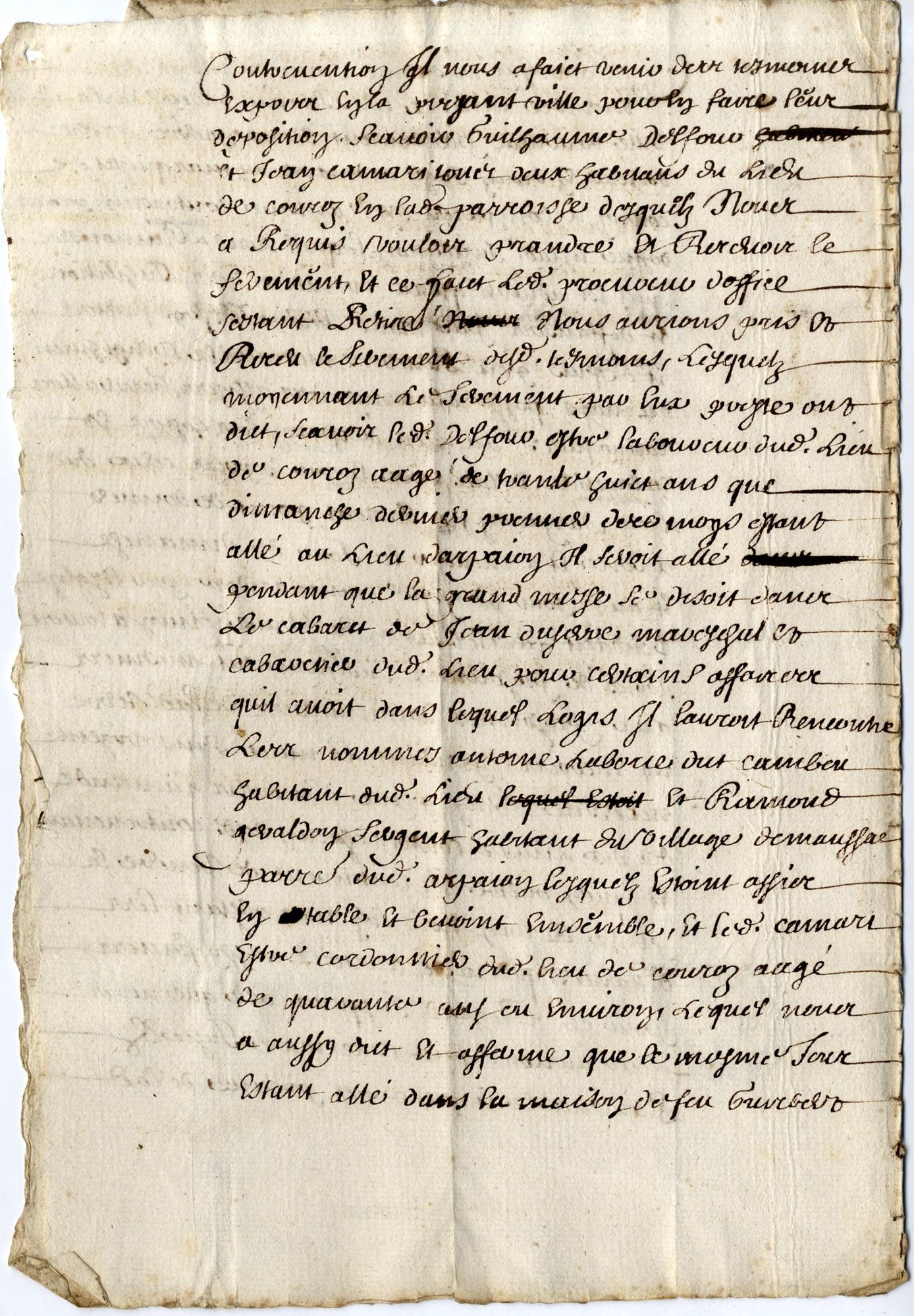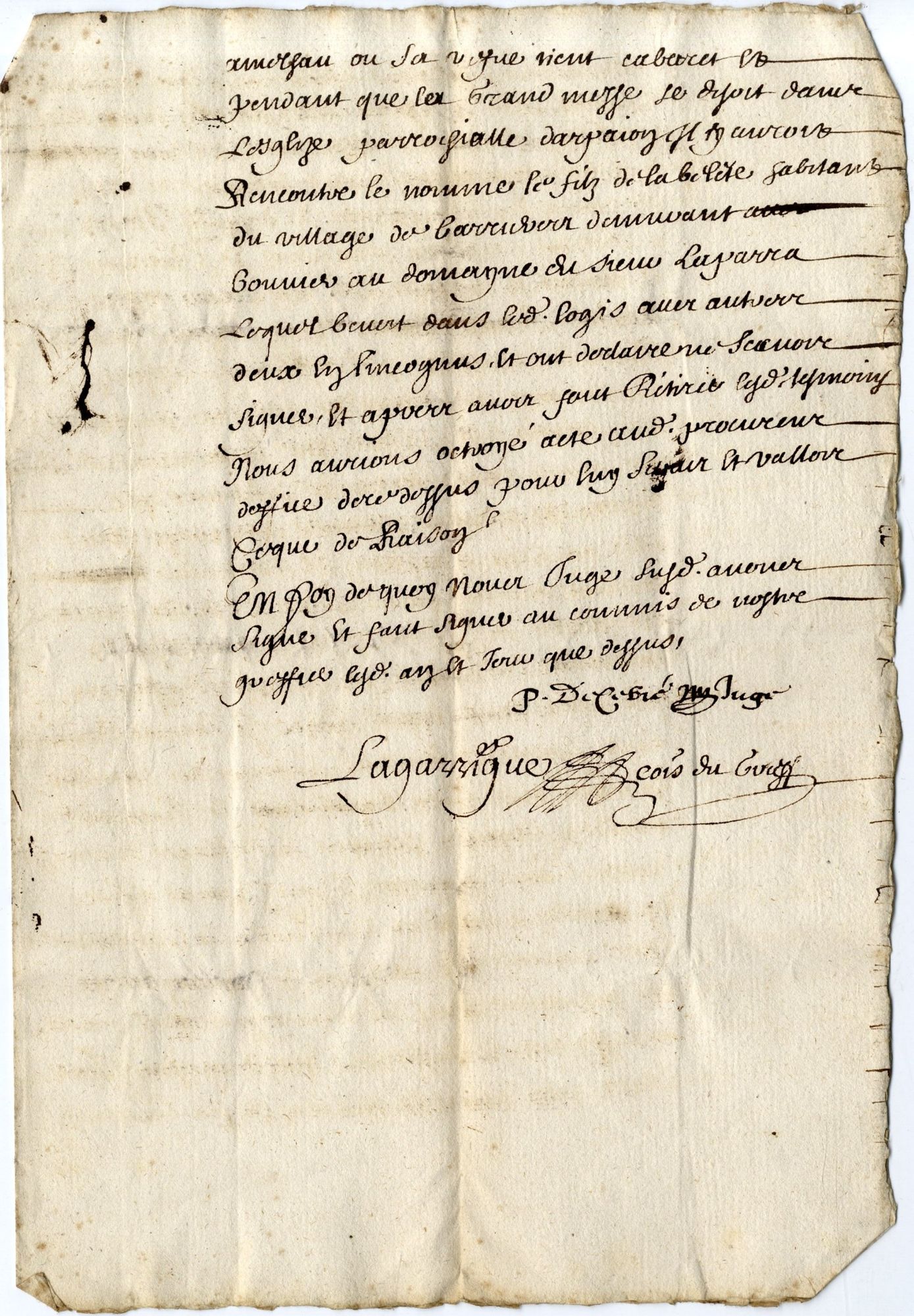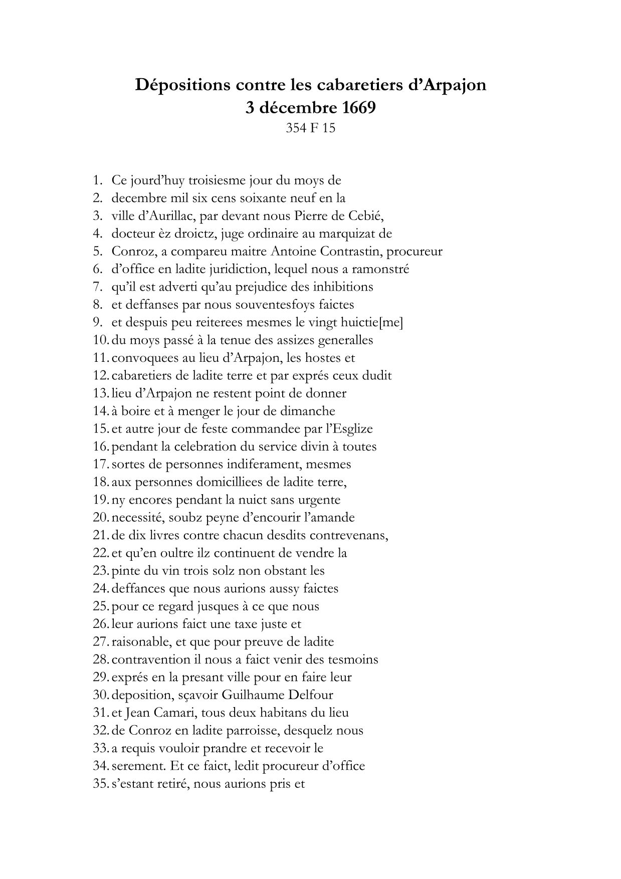 Le premier, un laboureur de 38 ans, dénonce Jean Duserre, maréchal-ferrant et cabaretier d’Arpajon : alors que le témoin se rendait au cabaret « pour certain[e]s affaires » pendant la grand messe le dimanche précédent, il constata que deux hommes, dont l’un était sergent, buvaient. On remarquera que s’il est en théorie interdit de manger et boire au cabaret pour les personnes habitant la paroisse, il semble tout à fait admis d’en faire un lieu de rendez-vous.