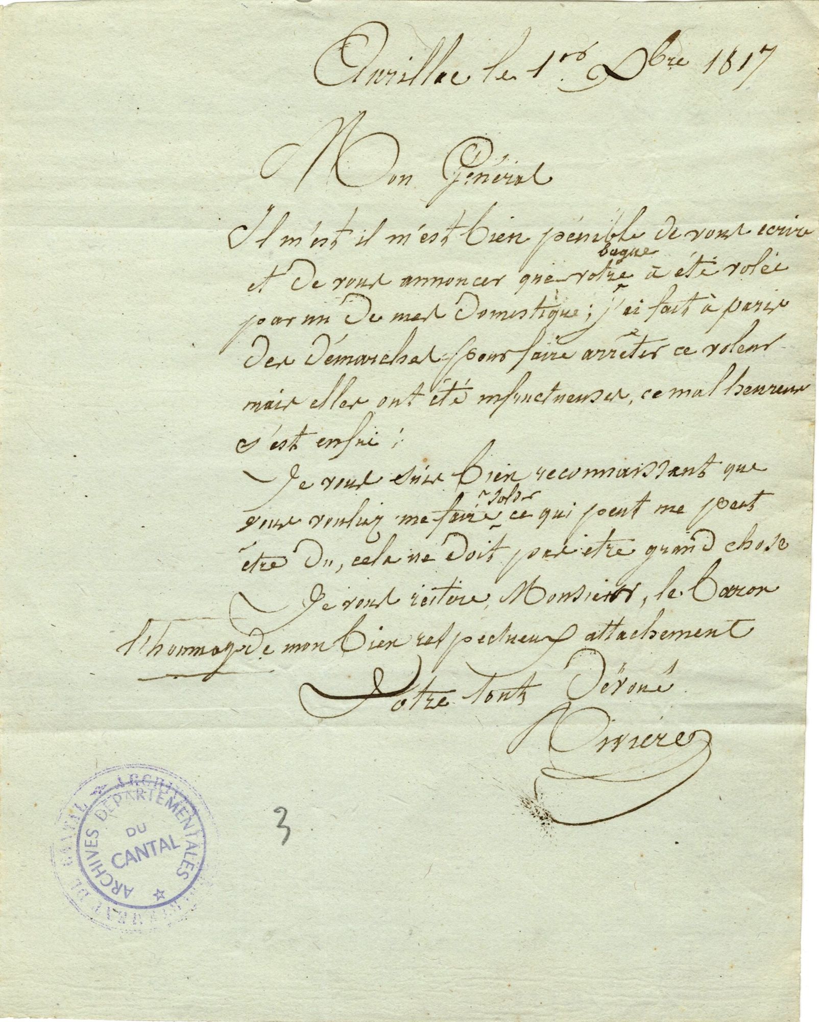 Les Archives départementales du Cantal conservent deux lettres autographes du baron d’Empire Pierre Cambronne (1770-1842), adressées à un officier aurillacois. Fils d’un sous-inspecteur des Eaux et forêts, Pierre Julien Rivière délaisse le Cantal pour intégrer l’armée impériale. Il s’y illustre certainement puisqu’en 1811, il se dit membre de la Légion d’honneur. A cette date, l’armée française est impliquée dans la campagne d’Espagne et tente de maintenir ce pays ainsi que le Portugal sous la domination de Napoléon Ier. Julien Rivière se trouve alors à Valladolid en tant qu’officier-payeur des chasseurs à pied de la Garde impériale, et constitue une procuration en faveur de son père. Parmi les témoins signataires se trouve un certain Cambronne, avec lequel Rivière va se lier d’amitié.
