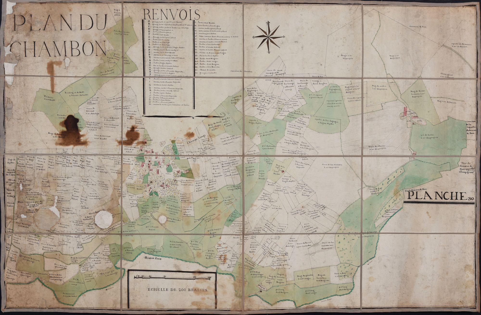 Centré sur le Chambon d’Anglards-de-Salers, ce plan n’est pas sans nous rappeler le cadastre napoléonien : il fait apparaître tous les tracés des parcelles ainsi que les chemins, mettant en évidence les bâtiments en les rehaussant d’un trait d’aquarelle rose. Il lui est cependant antérieur : l’échelle est donnée en brasses, une mesure remplacée à partir de 1795 par le système métrique actuel (la brasse valait 1,7866 mètres). D’autres planches nous donnent un indice quant au contexte dans lequel ces planches ont été dessinées : certaines parcelles numérotées renvoient à la reconnaissance d’un tenancier « au nouveau terrier, folio ___ », le numéro du folio ayant été laissé en blanc.