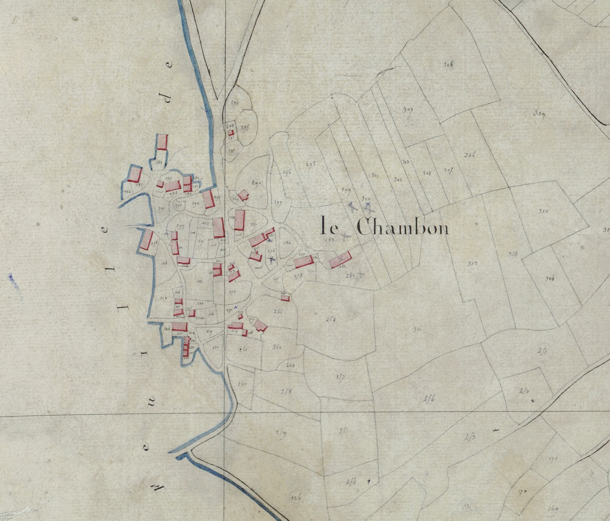Dressé quelques décennies plus tard, en 1808, le plan cadastral du Chambon confirmera les tracés relevés par l’arpenteur du terrier : on reconnaît les « champs longs » à l’ouest du village, même si certaines parcelles ont été réunies. L’arrivée de nouvelles maisons, notamment autour du couderc, est peut-être un indice de l’augmentation de la population. Finalement, la différence la plus flagrante réside dans le fait que, pressé par l’ampleur de la tâche, les agents de l’Etat ne prendront plus le temps ni de relever les microtoponymes, ni d’embellir leurs plans de sillons ou d’arbres.
