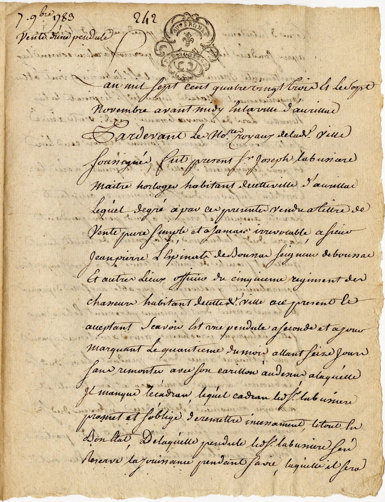 En cette année 1783, sans doute Joseph Labussière a-t-il besoin d’argent. Il va alors trouver un moyen de se constituer un revenu : vendre sa magnifique horloge… en viager. L’heureux acheteur se nomme Jean-Pierre Lespinats de Boussac, seigneur de Boussac à Saint-Simon, officier du cinquième régiment des chasseurs. Bien que la vente passée devant notaire le 7 novembre soit « pure, simple et à jamais irrévocable », l’acheteur accorde à l’actuel propriétaire la jouissance de la pendule contre bons soins pendant sa vie entière. L’horloge n’est pas neuve car il est précisé que, bien qu’elle soit en bon état, le cadran est manquant. L’artisan s’engage à le réparer avant son décès.
