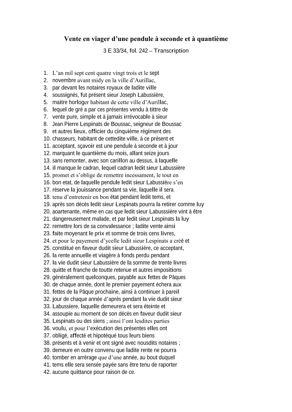 L’horloge est estimée à la somme de 300 livres (prix équivalent à deux bœufs), payables par tranche de trente livres à chaque fête de Pâques jusqu’au décès de Joseph Labussière, que celui-ci intervienne dans un délai inférieur ou supérieur à dix ans. Comme pour tout viager, l’acheteur prend donc le risque de payer l’objet de ses désirs extrêmement cher si la vie de l’horloger devait se prolonger. Toutefois, Jean-Pierre Lespinats semble avide de posséder cette pendule car il fait introduire une clause particulière dans le contrat : « en cas que ledit sieur Labussière vint à être dangereusement malade », l’acheteur pourra se saisir de l’horloge et ne la restituera que lors de la convalescence de l’horloger !