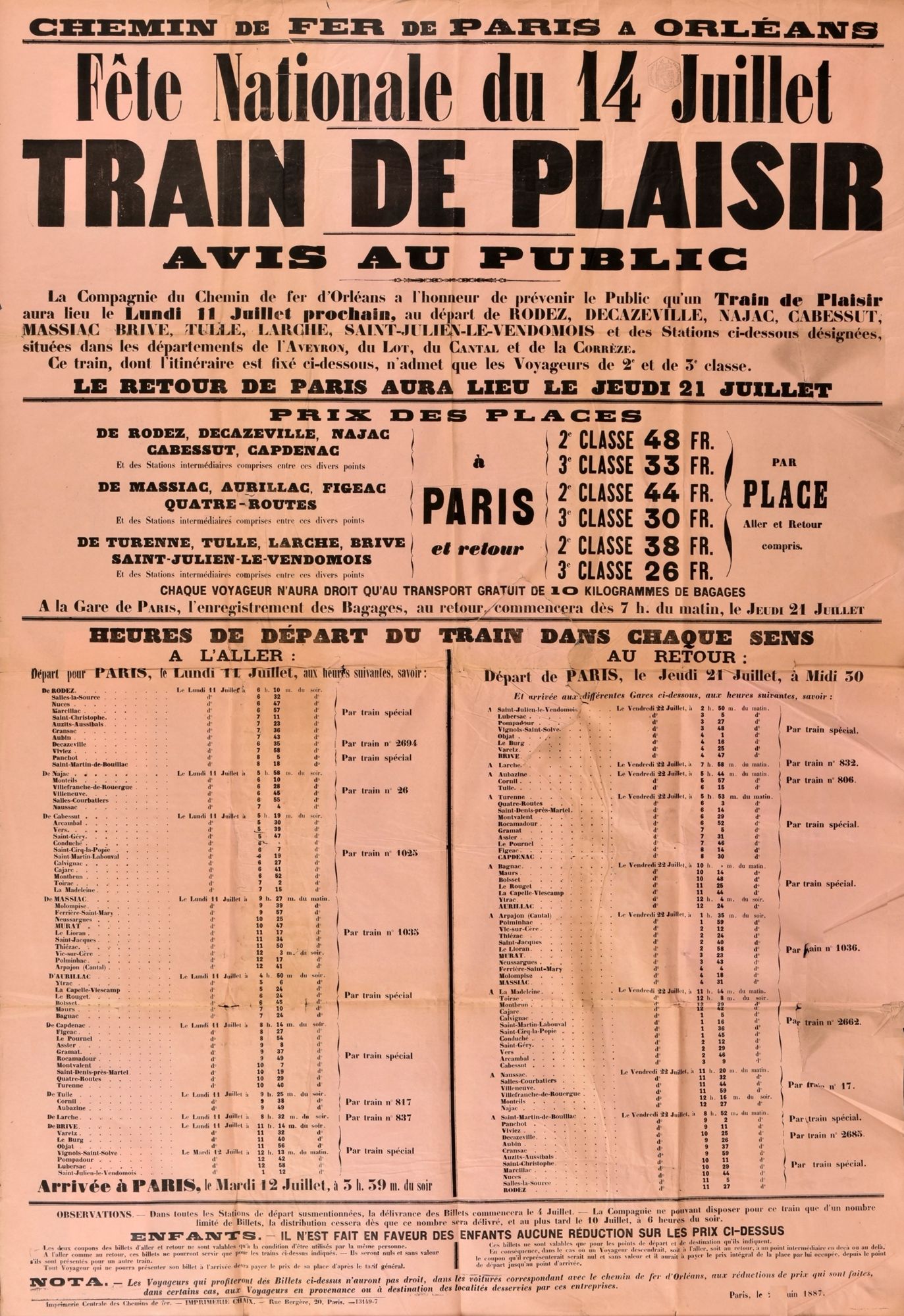 On remarquera que le voyage est encore plus long pour les Massiacois, à qui l’on propose de partir à 9h27 pour rejoindre le train d’Aurillac. La ligne de Massiac à Clermont-Ferrand était pourtant ouverte, mais elle était exploitée à partir d’Arvant par la Compagnie de chemin de fer de Paris à Lyon et à la Méditerranée. En l’absence de concertation entre les deux compagnies, les habitants de Massiac sont peu avantagés. Le plaisir promis par ce train sera peut-être au rendez-vous le 14 juillet à Paris, mais il est difficile d’imaginer que le trajet lui-même soit une partie de plaisir !