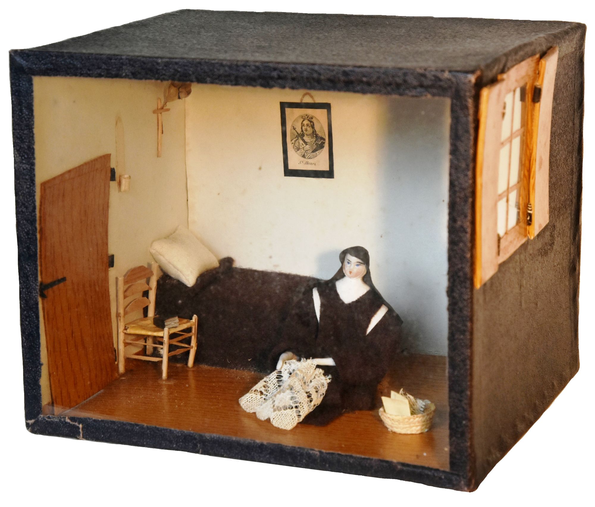 Cette maquette, conservée dans les collections des Archives départementales, est une maquette de cellule de carmélite. Au-dessus de la porte figure l'inscription "Sainte Philomène" (vocable de la chapelle du Carmel d'Aurillac). Au milieu de la pièce, une carmélite assise travaille à sa dentelle ; à côté d'elle, posé à terre, un panier à ouvrage contient de la dentelle. Le lit, garni d'un oreiller, est couvert d'une couverture marron, de la même étoffe que l'habit de la religieuse. Sur la chaise, utilisée en guise de table de nuit, est posé un livre. Sur la bibliothèque, qui comprend quatre livres portant respectivement sur la tranche les lettres "P", "E", "A" et "H", est posée une couverture ou une serviette blanche pliée. Au mur, outre un bénitier et un crucifix avec son rameau, se trouvent un portrait de saint Henri et celui de Notre-Dame. Cette boîte de nonne est l’œuvre de Noémie Lacoste née le 23 juillet 1889 au hameau de Frayssi, commune de Saint-Cernin, fille de Clothilde Marty, ménagère, et de Jean Lacoste, cordonnier. Elle entre au Carmel d’Aurillac le 2 juillet 1909 et devient Sœur Marie du Sacré-Cœur le jour de sa prise d’habit le 19 janvier 1910.
