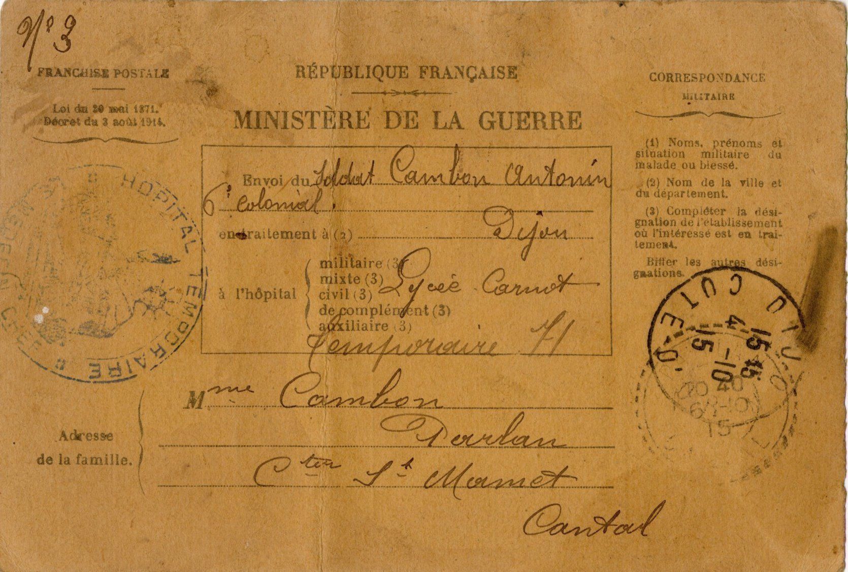 Suite à cette blessure, Adrien Cambon est transféré à l’hôpital temporaire 71, au lycée Carnot de Dijon ; avant d’être dirigé vers un hôpital spécialisé dans les plaies de la face. Il est admis à la réforme par décision ministérielle du 10 janvier 1917.