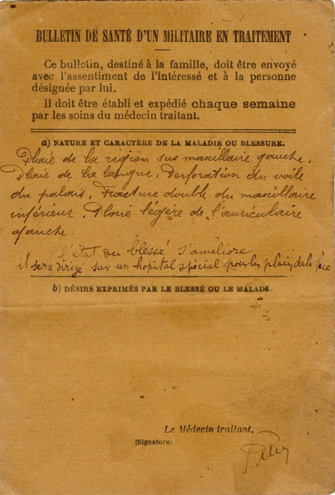 Blessé au niveau du visage, il est désormais une « Gueule cassée », terme qui désigne les survivants de la 1ère Guerre mondiale ayant subi une ou plusieurs blessures au combat et affectés par des séquelles physiques notamment au niveau du visage.