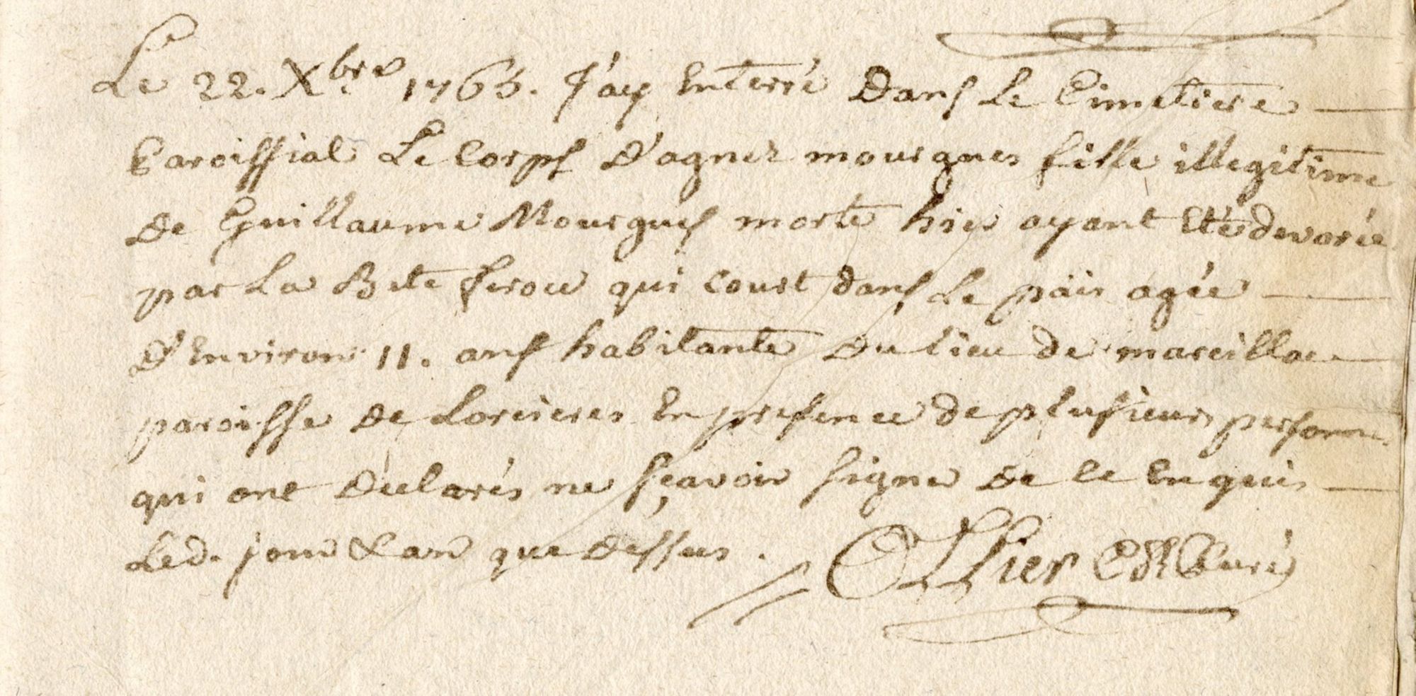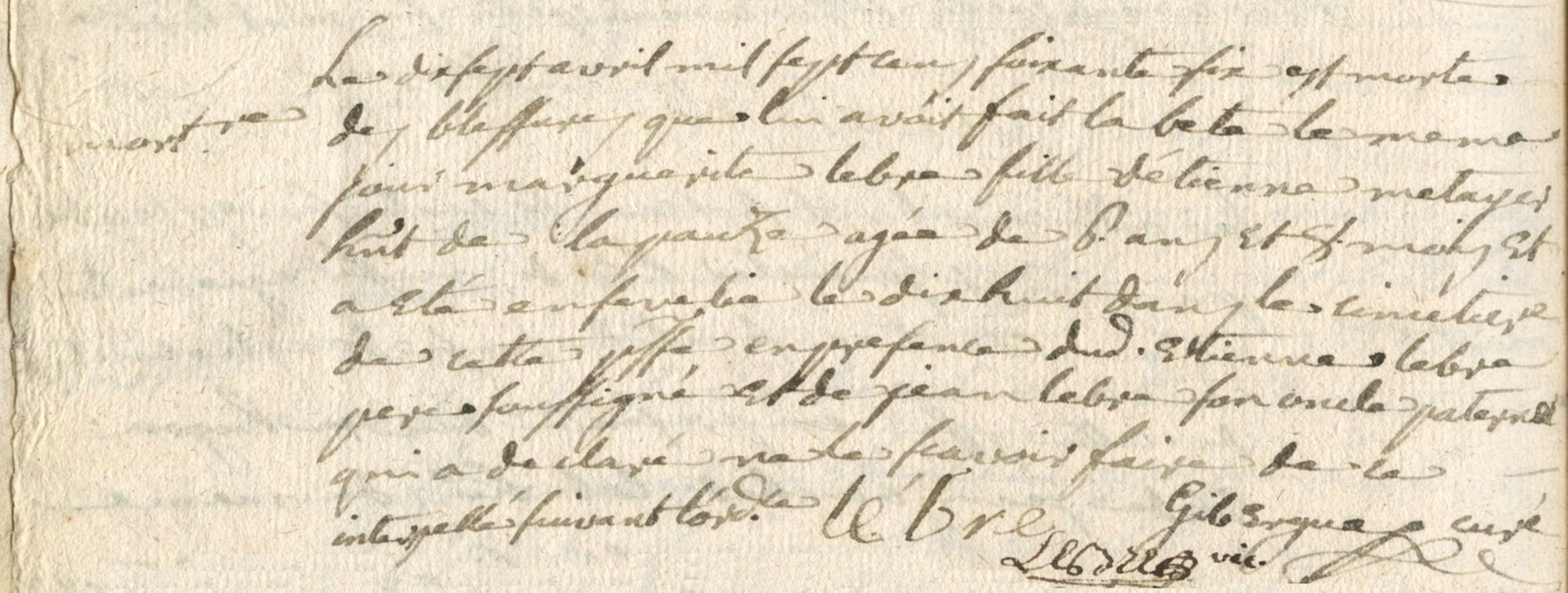 Durant l’année 1766, sept enfants sont tués parmi lesquels Marguerite Lèbre. Attrapée devant sa grande sœur, sur la commune de Clavières, juste en contrebas du mont-Mouchet, elle meurt « des blessures que lui avait fait la bête ». Agée de six ans à son décès, elle est la plus jeune et l’ultime victime de la créature dans le département.
