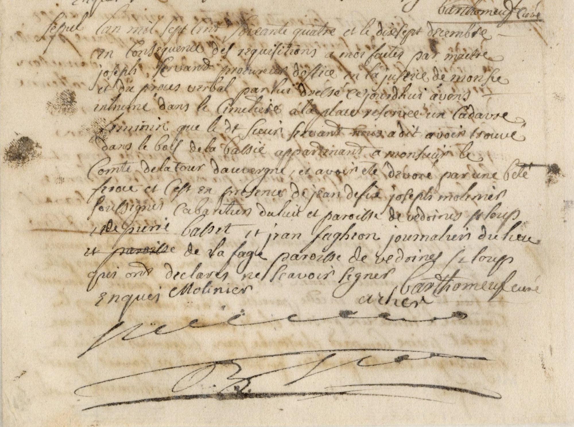 Durant le mois de janvier 1765, six décès sont comptabilisés dans le Cantal. Souvent jeunes, les victimes sont des bergers ou des travailleurs de la terre, comme Catherine Boyer qui épandait du fumier lors de l’attaque. Gravement blessée à Lastic le 15 janvier, elle succombera à ses blessures le 27 mars à l’hôpital de Saint-Flour.