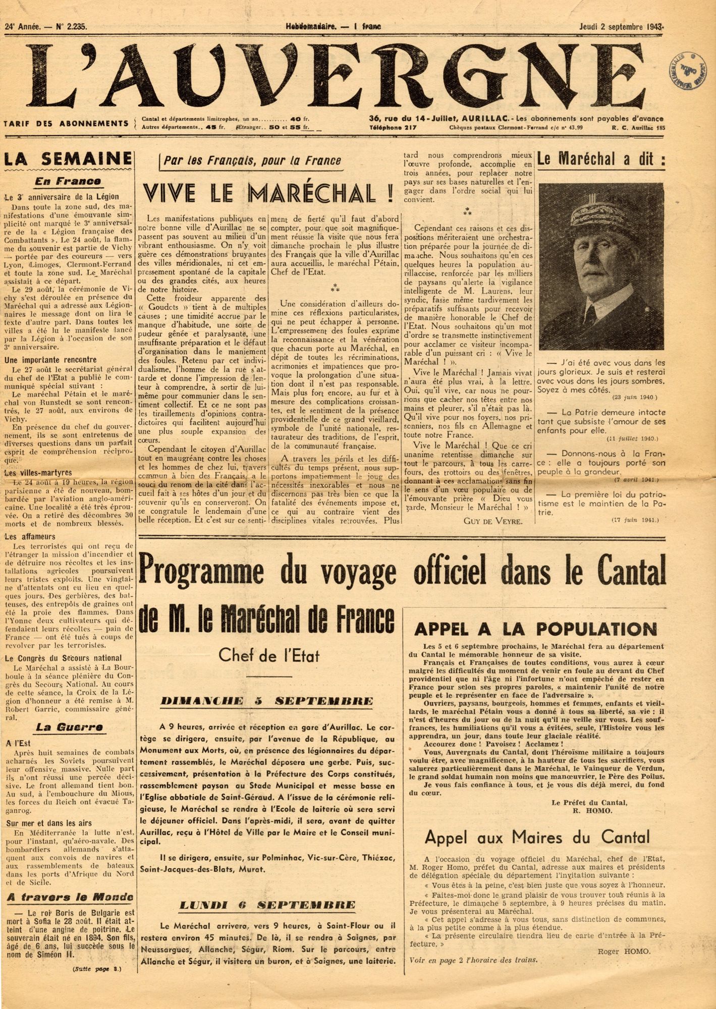 Pétain face à l’opinion cantalienne : les débats autour d’une visite officielle (5 et 6 septembre 1943)